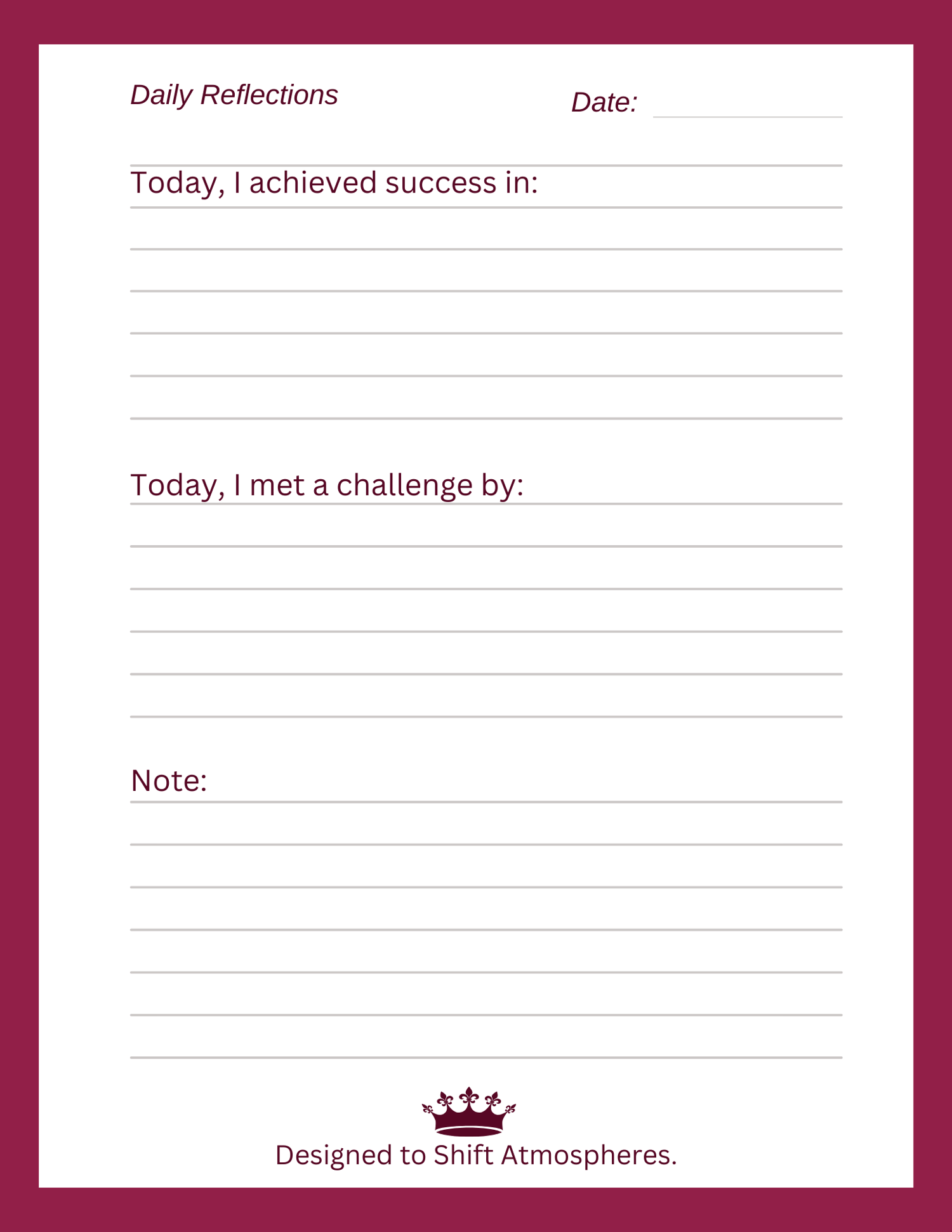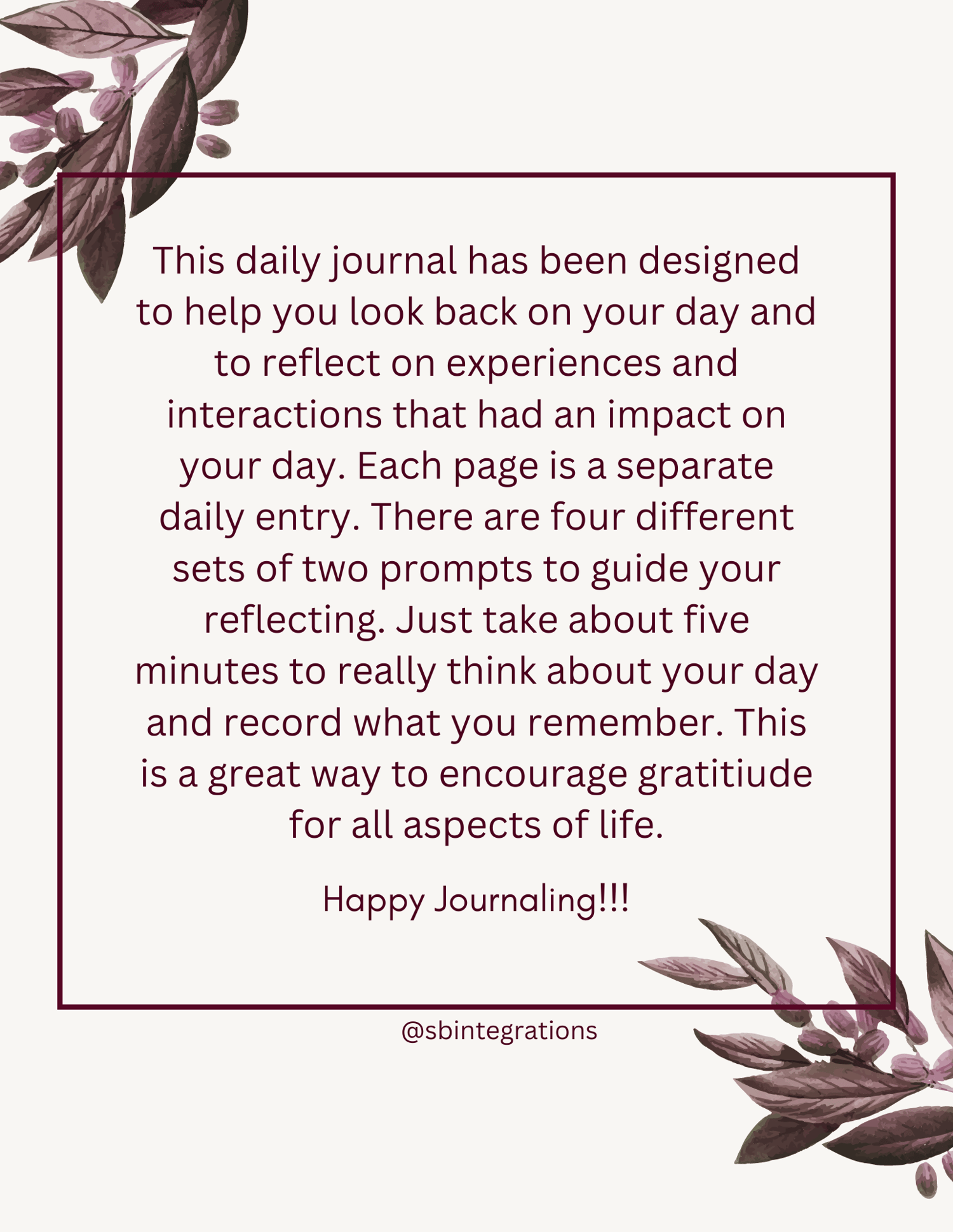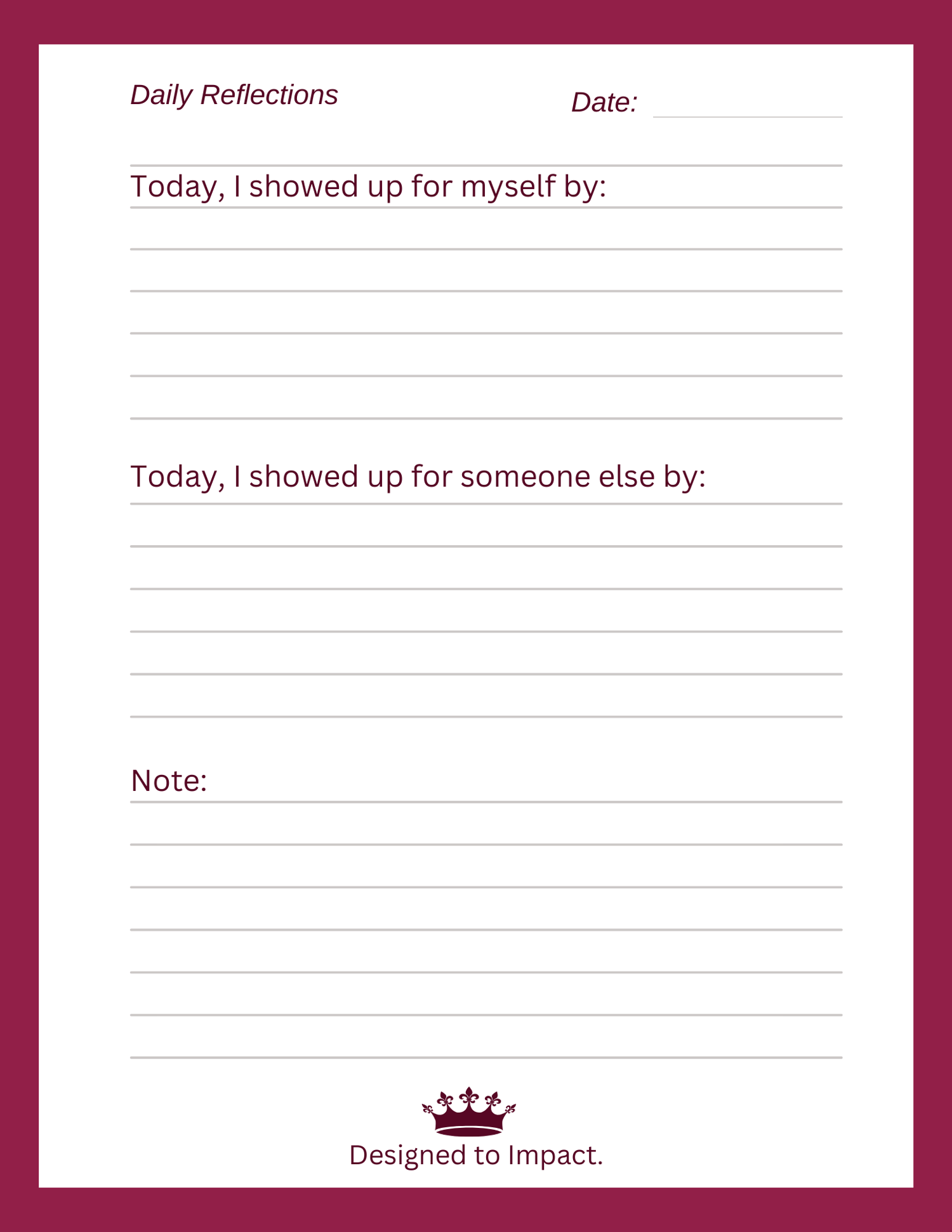 The Burgundy Daily Journal has been designed to be a reflection point guide. It is a journal with prompts to help guide you on how you think about your day, how you recognize your own progress and growth, and how you show up for others. Journaling can help us cultivate a spirit of gratitude for the life we get to live.