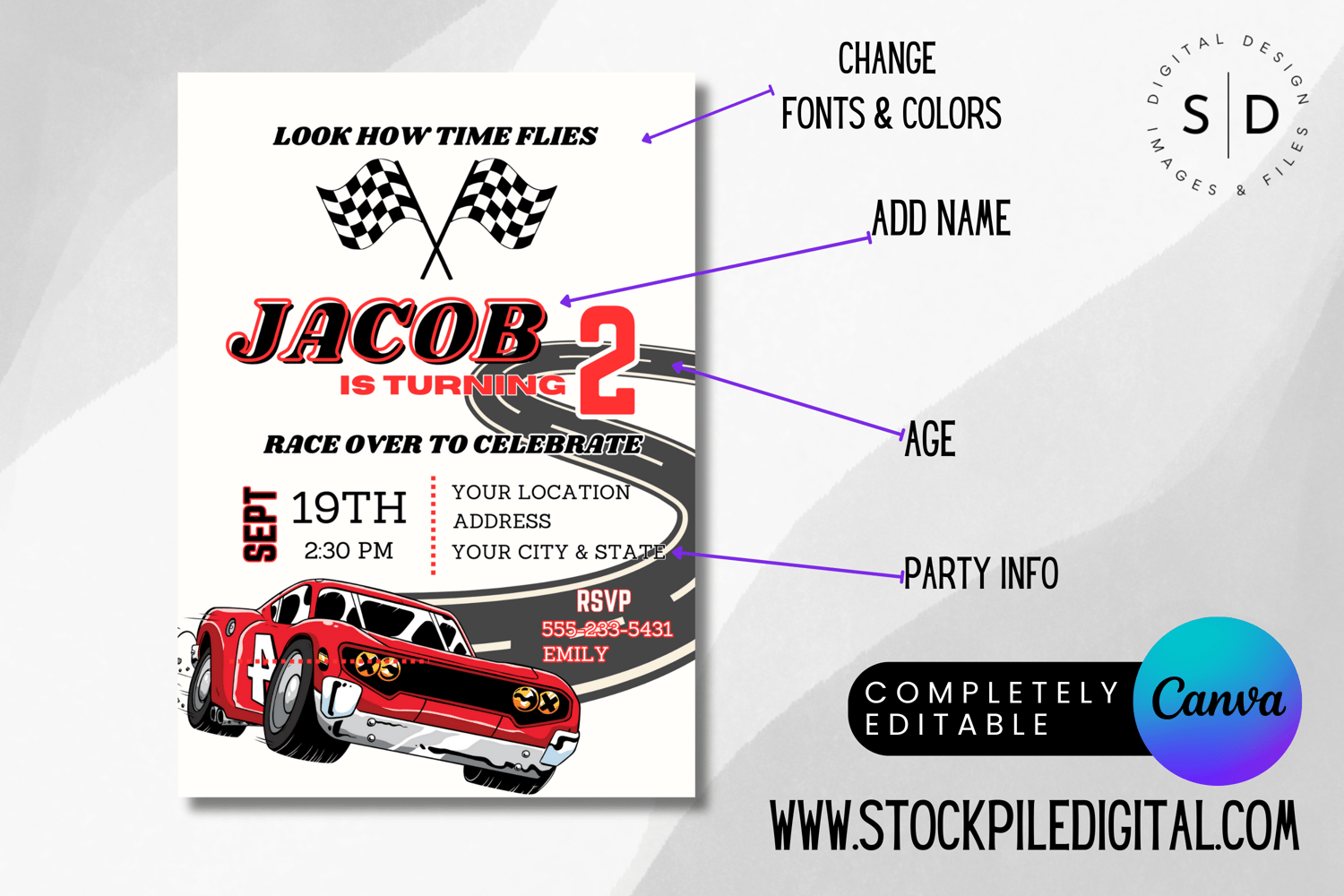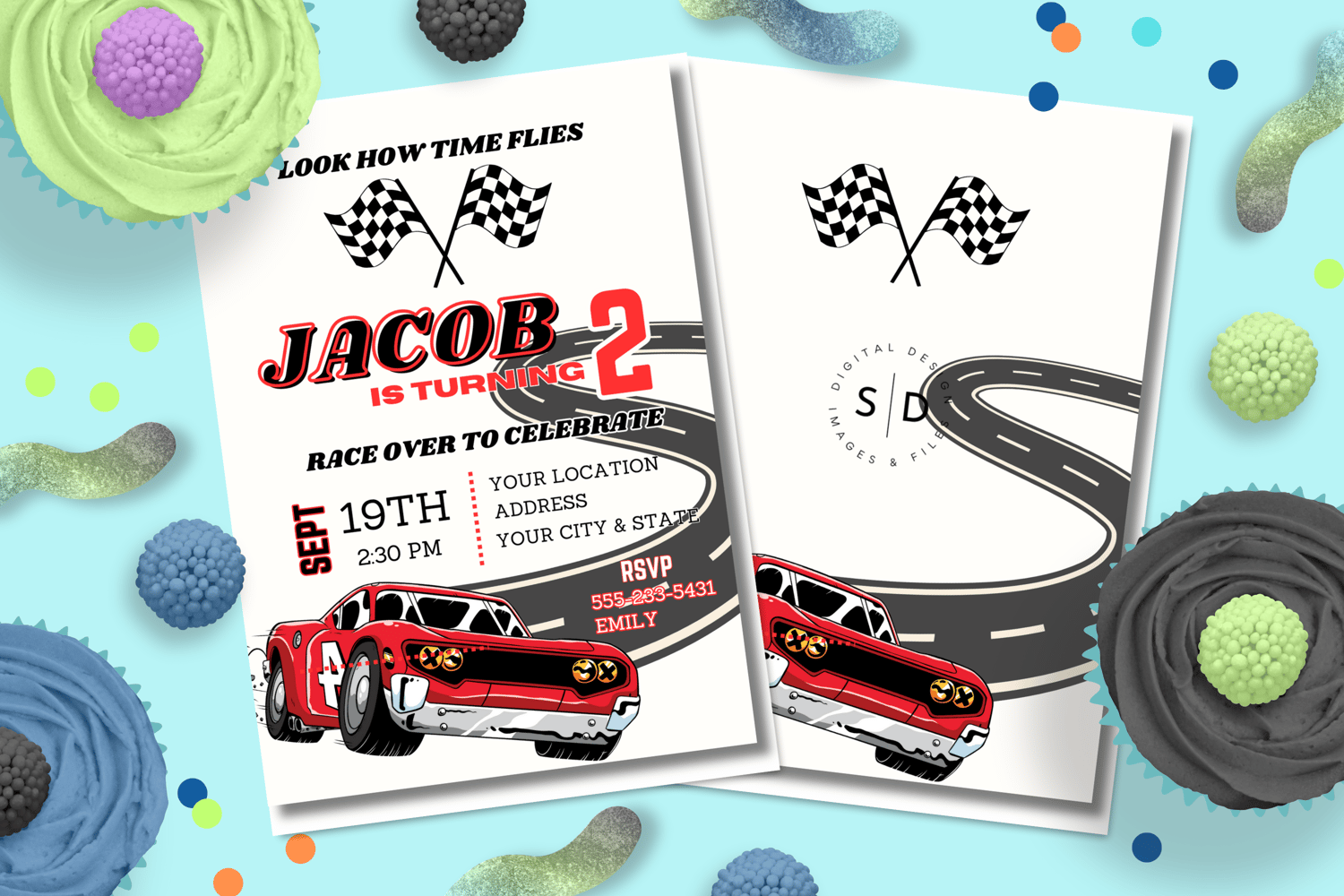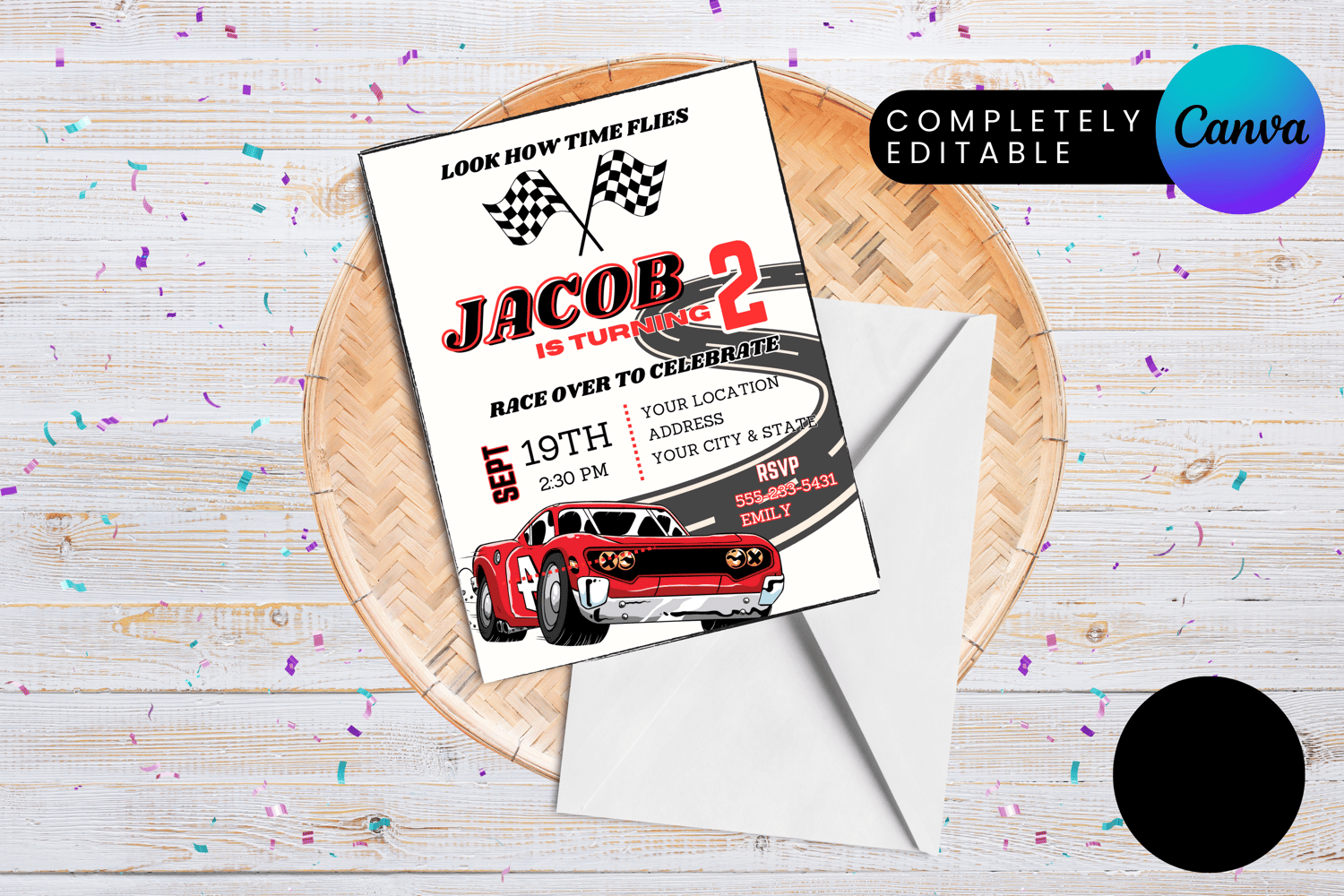 Make your child's special day even more memorable with the Time Flies Racecar Birthday Party Invitation Canva template. With its eye-catching design and matching colors, this customizable template is sure to make a lasting impression on guests. Create unique invitations quickly and easily – perfect for your little racing fan!