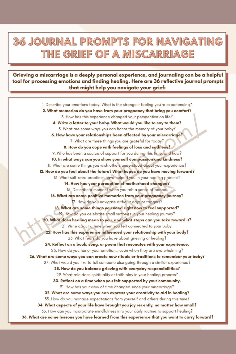 Grieving a miscarriage is a deeply personal experience, and journaling can be a helpful tool for processing emotions and finding healing. This worksheet offers 36 reflective journal prompts that might help you navigate your grief.