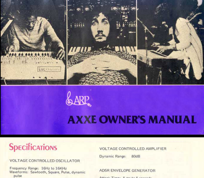 User Manual for the ARP Axxe Synthesiser. The little brother of the almighty ARP Odyssey.