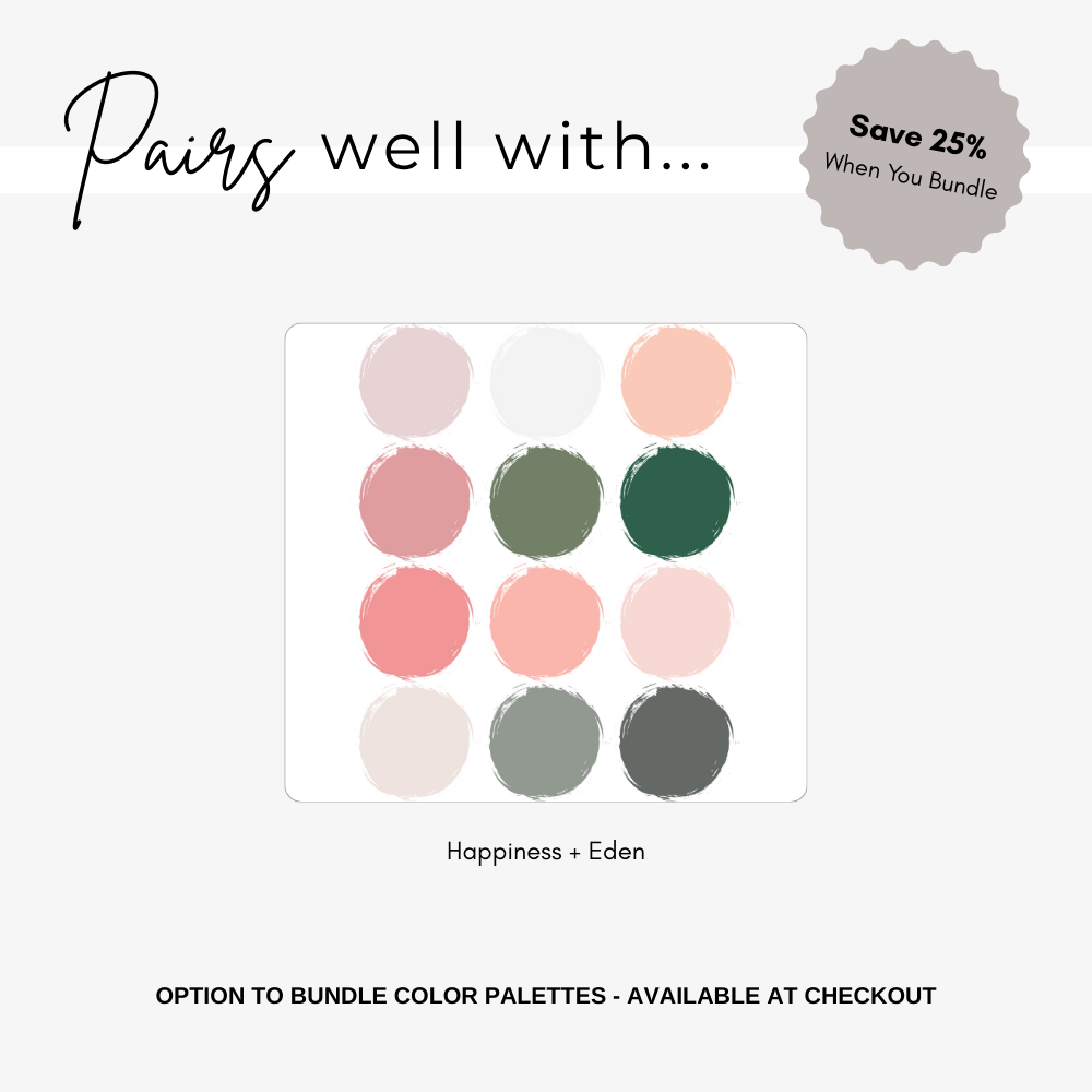 Bring a little bit of Happiness to your small business branding with this exquisite modern vintage color palette, featuring emerald and moss green, pink, and peach hues. Perfect for digital artists, this collection offers aesthetic color combinations ideal for logos, social media graphics, and Etsy shop banners and designs. Compatible with Procreate and Canva, each palette includes Hex Codes, RGB, and CMYK values, ensuring seamless integration into your projects. Embrace the natural themes of this clean, minimalist palette, designed to enhance any website color scheme or brand. Transform your creative vision with this thoughtfully curated bundle, crafted to support your artistic journey.
