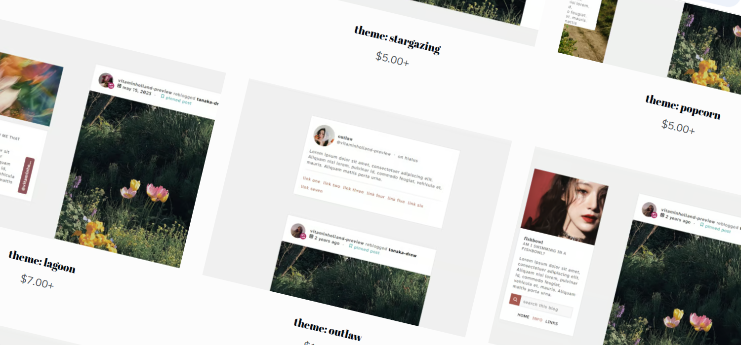 hello! thank you for showing interest. may i introduce you: themes collection by me (tanaka-drew), a plethora of premium tumblr themes from december 2019 - present**.