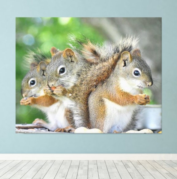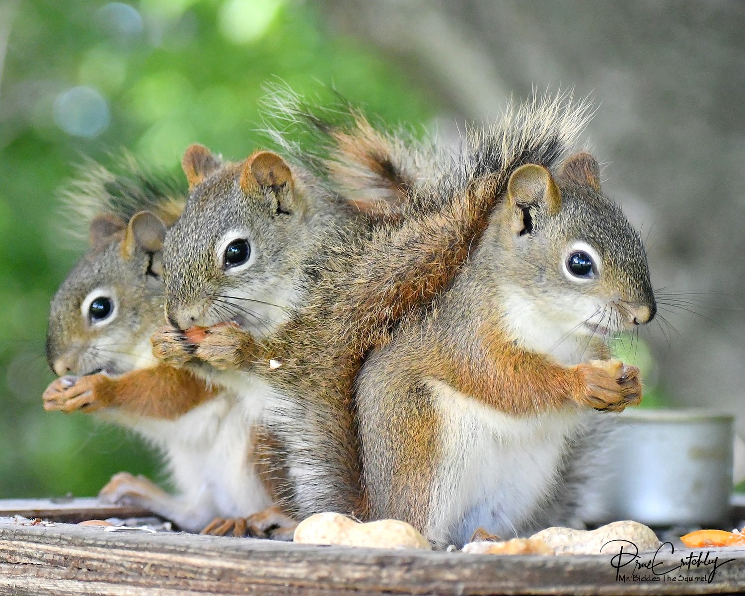 This is a photo I took of three baby American Red Squirrels. They were born in the spring of 2024. The father of these two is Mr. Bickles The Squirrel. Their mother is Freda she is the one in the center of the photo! For a month or so they would come to the same table to eat before they left home for new adventures! They always looked so cute sitting together.