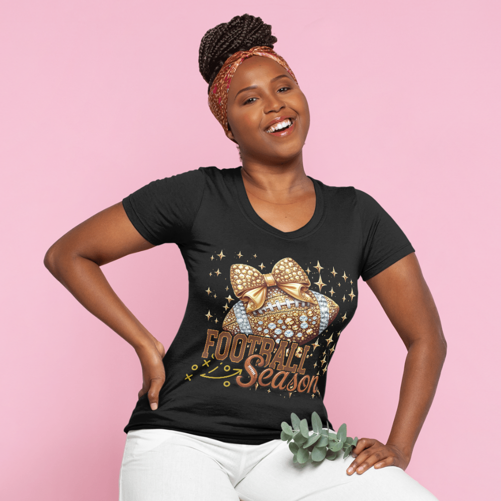 Shine bright all game day long with our “Football Season” Bling Inspired Tee! This dazzling design features a sparkling football topped with a glamorous gold bow, surrounded by shimmering stars—perfect for showing your love for the game in style.