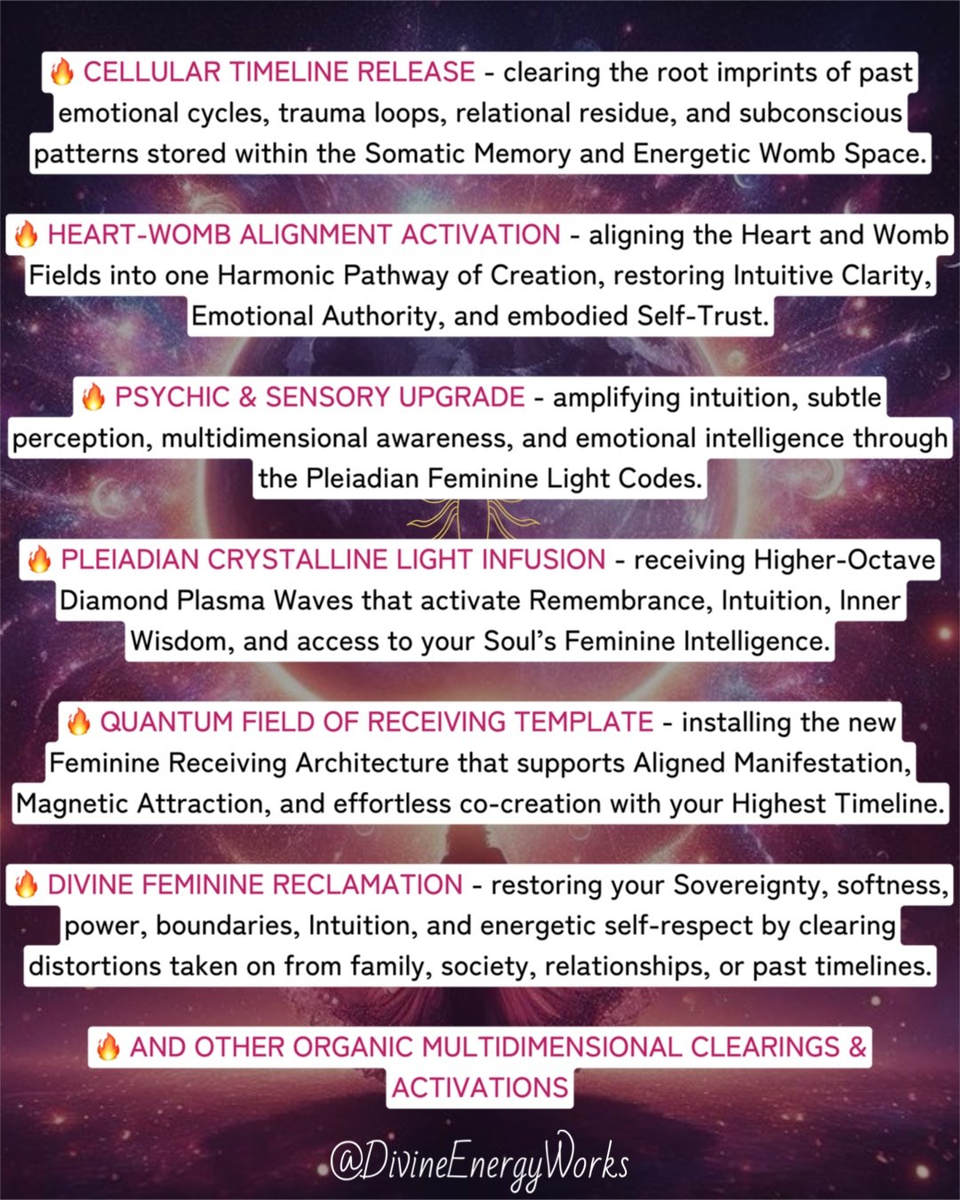 This is a QUANTUM FIELD OF FEMININE RECODING - DNA Womb Coding, Psychic Sensitivity, Quantum Intuition, and Multidimensional Inner Sight, while clearing outdated identities, karmic emotional imprints, and old “operating systems” of control. Through Alcyone’s Diamond Light Transmissions, the Heart–Womb channel opens, restoring the power of Emotional Sovereignty, Magnetic Manifestation, and Feminine Creation from pure authenticity rather than survival.