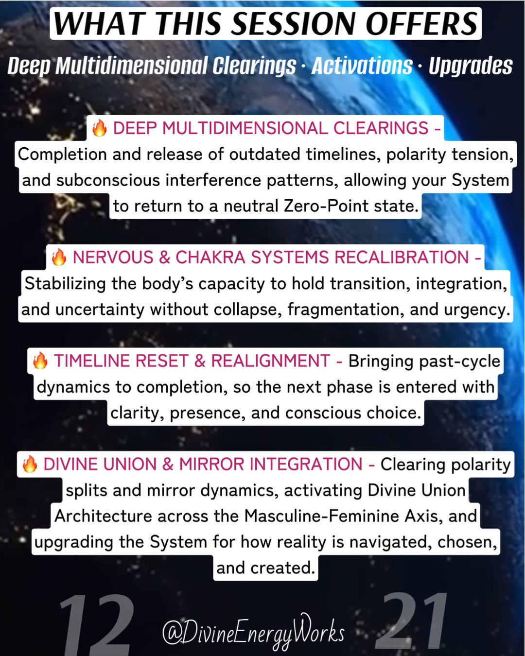 Clearing residual energetic structures from 2025 that keep the system oriented to Completion, effort, or holding patterns. These clearings work through the Nervous System and core energetic Axes to release stored pressure, unresolved energetic loops, and internal holding patterns that cannot move forward into the next cycle, and create space for New Architecture to land.