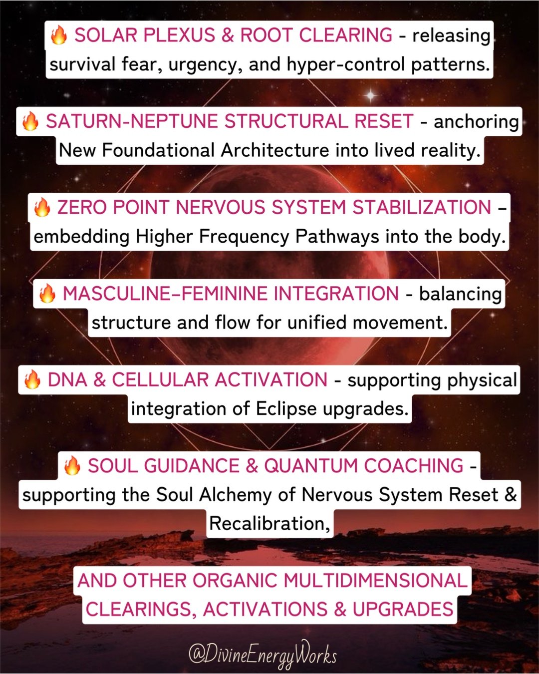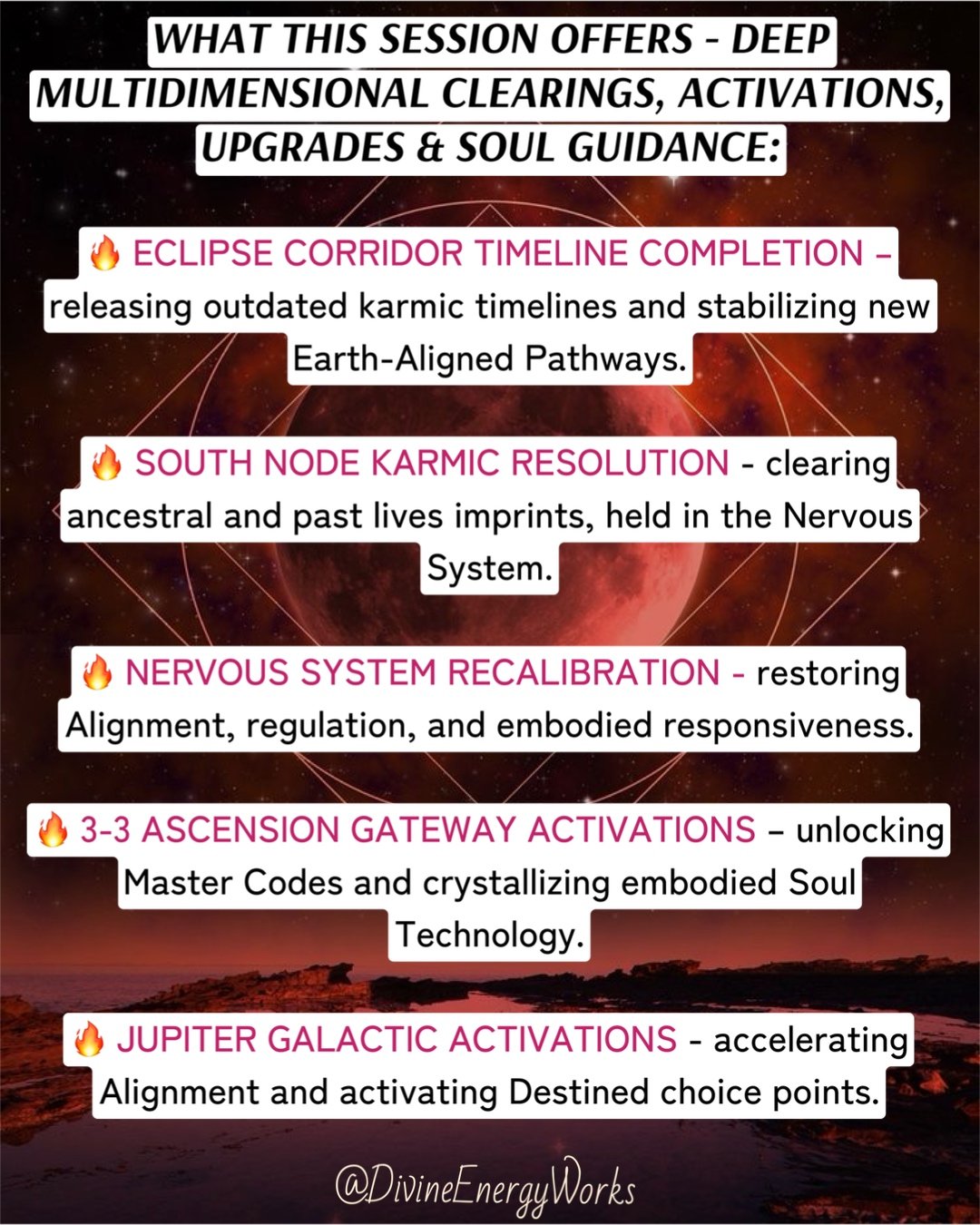 🔥 Eclipse Corridor Timeline Reset & Karmic Completion - releasing outdated karmic timelines, Soul contracts, and structural imprints that no longer belong in the Upgraded Field, while stabilizing New Earth-Aligned pathways forward.