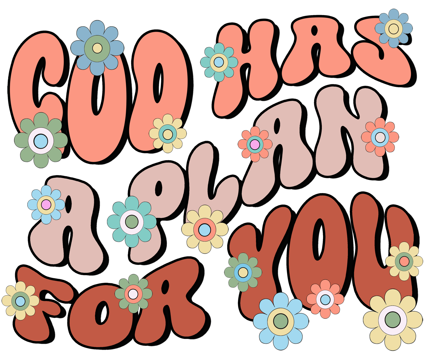 - Spread encouragement and faith with this colorful retro-style “God Has a Plan for You” PNG design. Featuring bold bubble letters and cheerful flower accents, this design brings a positive, faith-filled message to life with a fun 70s vibe.