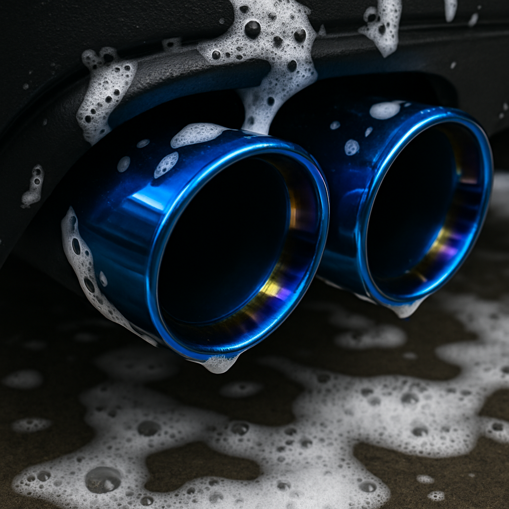 The task is to meticulously clean and polish metal exhaust tips. This involves using appropriate metal polishes, compounds, and specialized tools to remove carbon buildup, tarnish, oxidation, and road grime, aiming to restore the metal's original luster and shine.