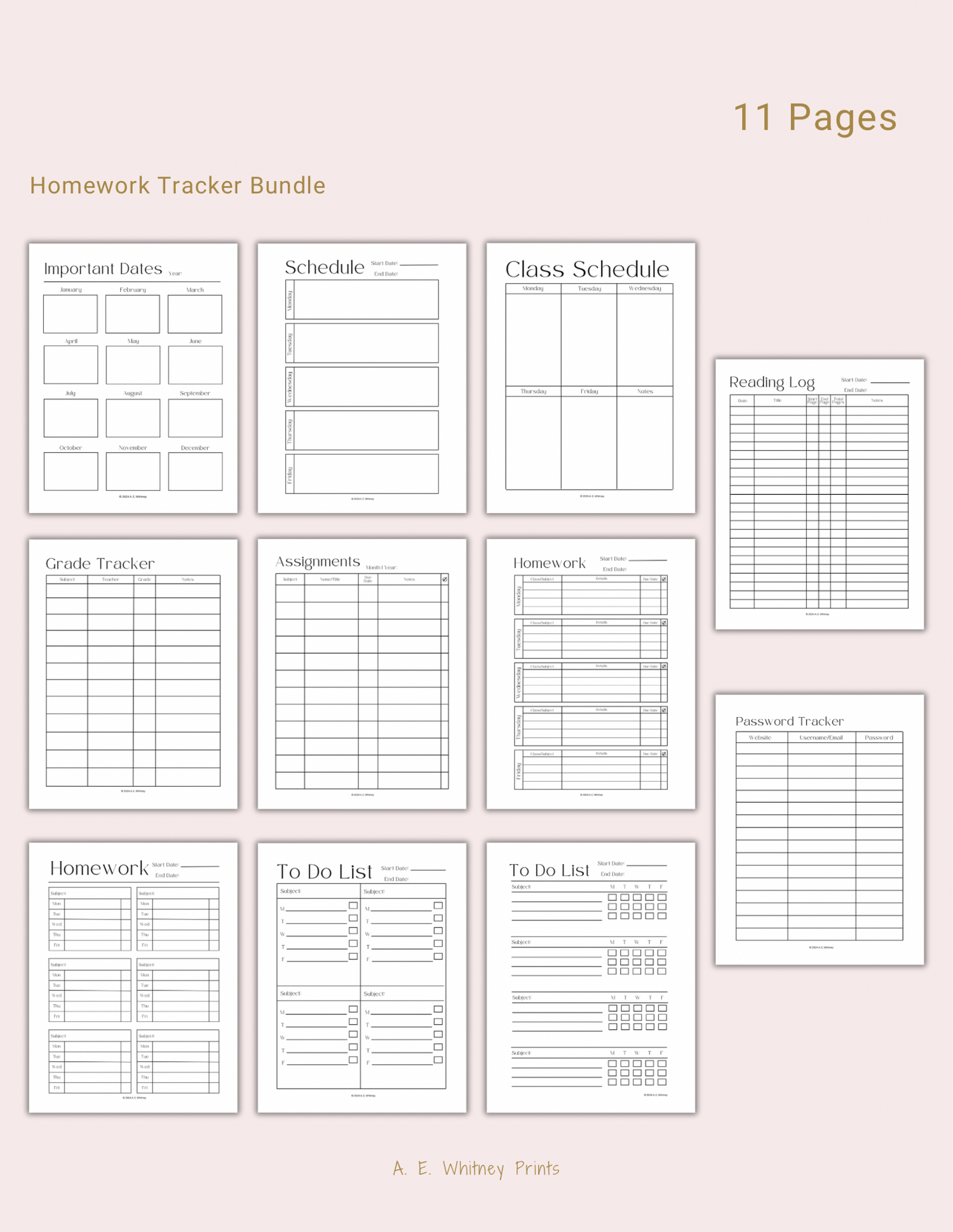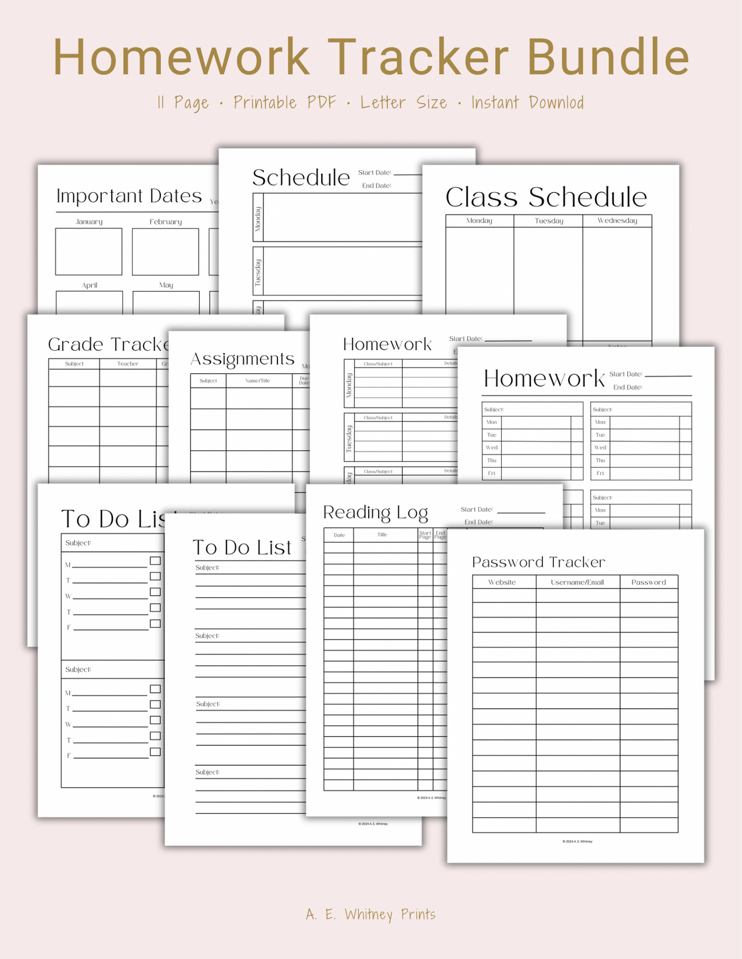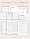 Printable Minimalist Style Homework Tracker Worksheet/Planner Page Bundle