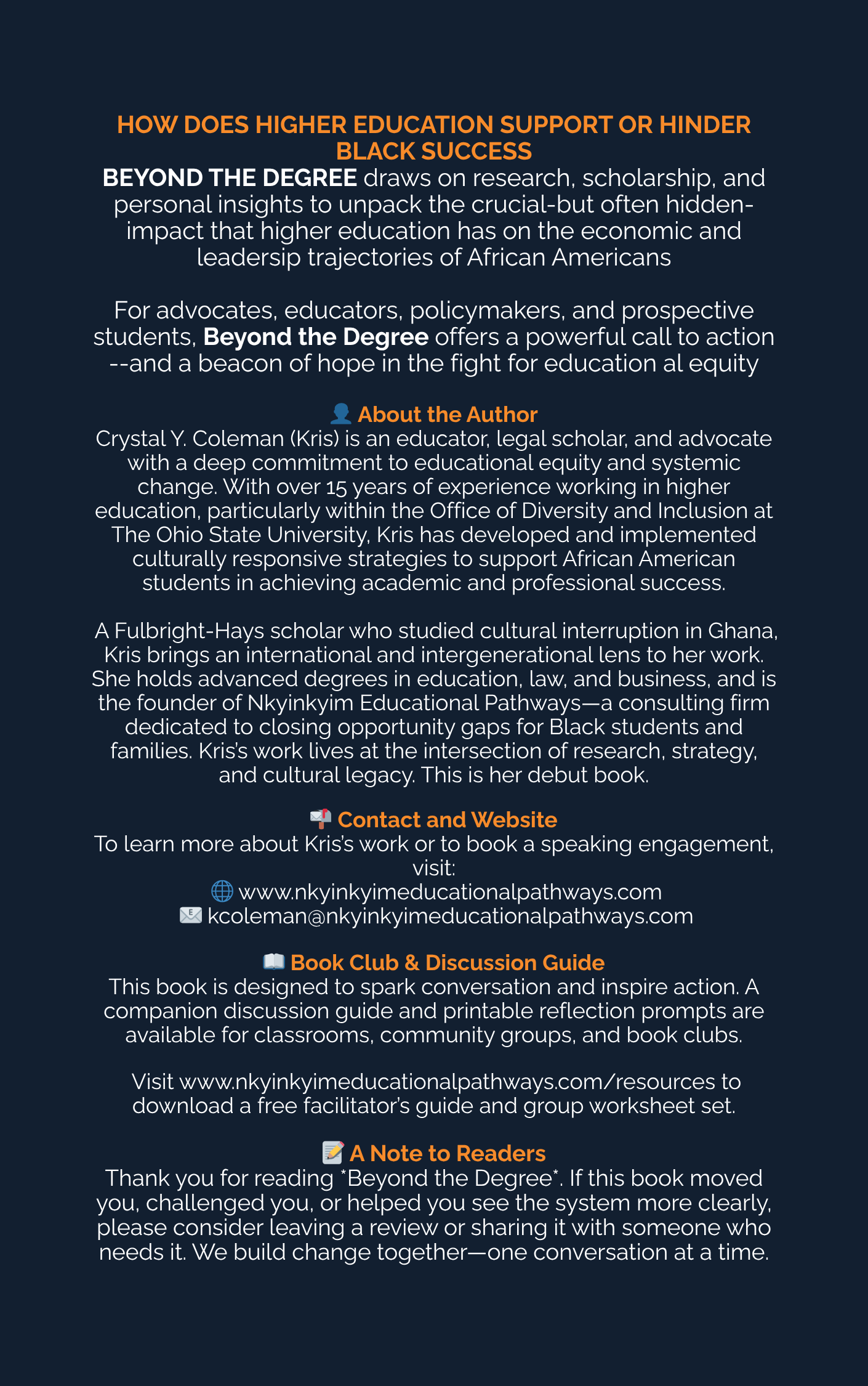 In Beyond the Degree, educator and advocate Crystal Y. Coleman—known as Kris—delivers a powerful examination of how race, policy, and systemic barriers continue to shape the educational and leadership journeys of African Americans. Backed by data, lived experience, and deep cultural insight, this groundbreaking book explores how Black students are navigating college—and what happens when they graduate into unequal workplaces.