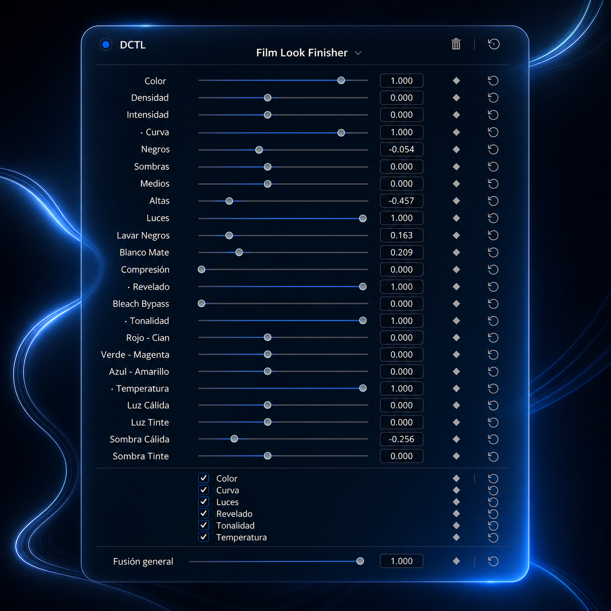 Film Finish es un DCTL diseñado para aplicar después de tu conversión de color. Te da control sobre los acabados que definen el cine: