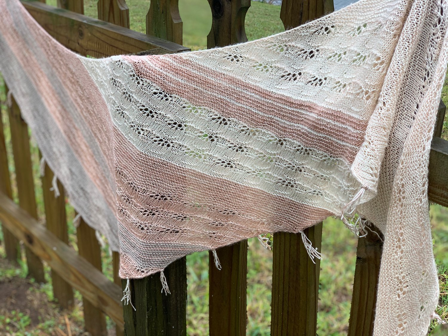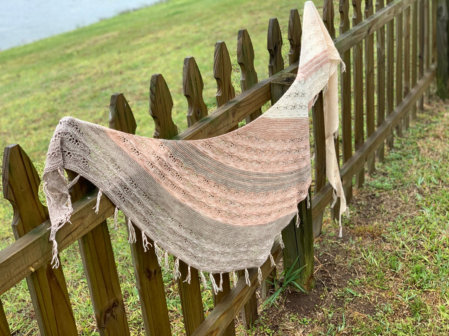 The three lovely colors of Silky Single from Periwinkle Sheep reminded me of ice cream colors. So much so, that when I was planning the shawl I listed the colors as strawberry, vanilla, and chocolate in my notes! This beautiful shawl is made up of bands of lace and garter stitch stripe and is fun knitting with luxurious yarn. Grab a crochet hook to make the fringe application super easy!