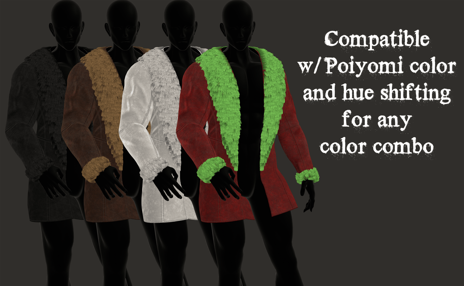 3D Low-Poly Model - Realistic black leather jacket with scruffy fur collar. Additional colors included for the leather jacket for different color combinations. Hair cards with an alpha mapped texture give the fur a very realistic look. Fur textures provided are given as greyscale for Unity coloring/hue shifting. Most leather color textures are also compatible with Unity coloring/hue shifting. The jacket is also textured to be able to be used without any fur at all to become a leather jacket with a wide collar fold.