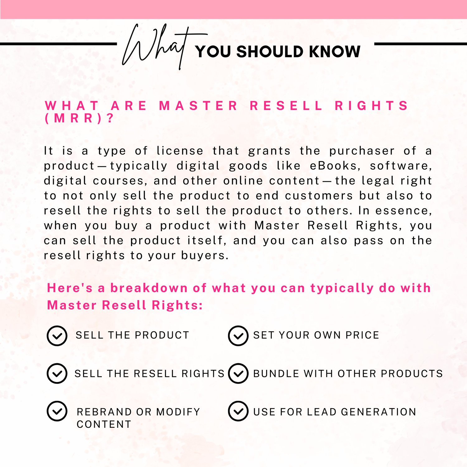 Here's a breakdown of what you can typically do with Master Resell Rights: