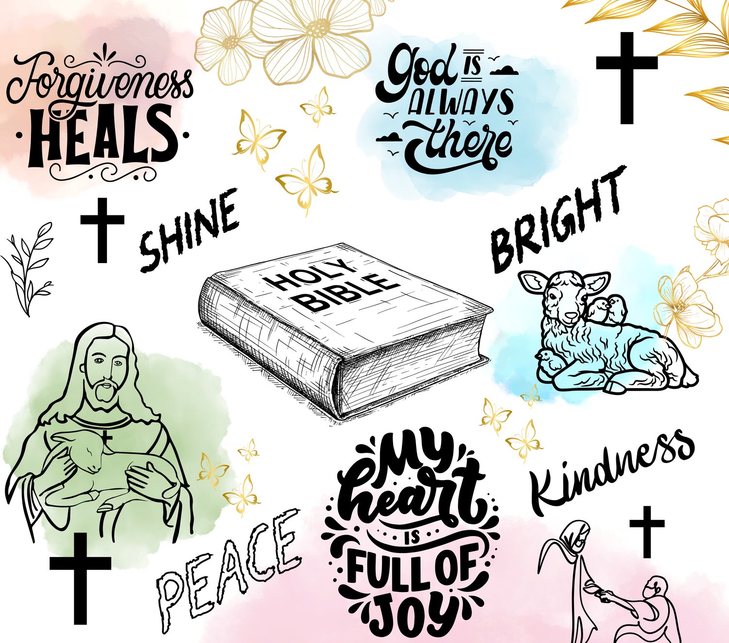Featuring soft watercolor pastels, hand-drawn illustrations of Jesus, the Holy Bible, crosses, butterflies, and gentle floral accents — this tumbler is perfect for anyone who loves faith-based designs.
