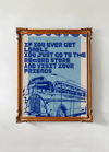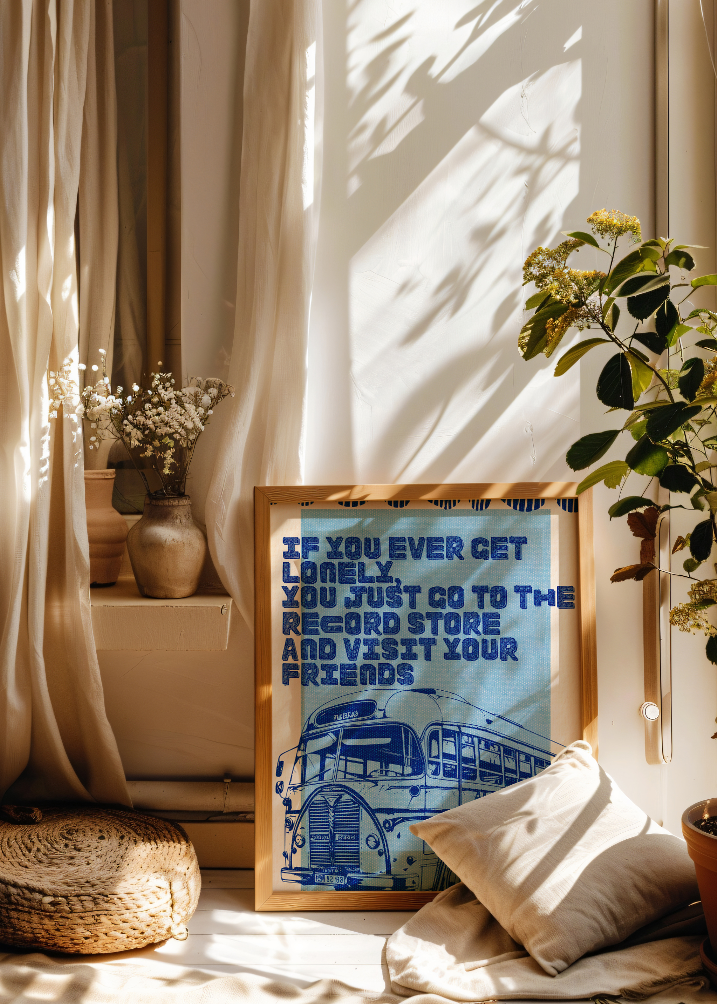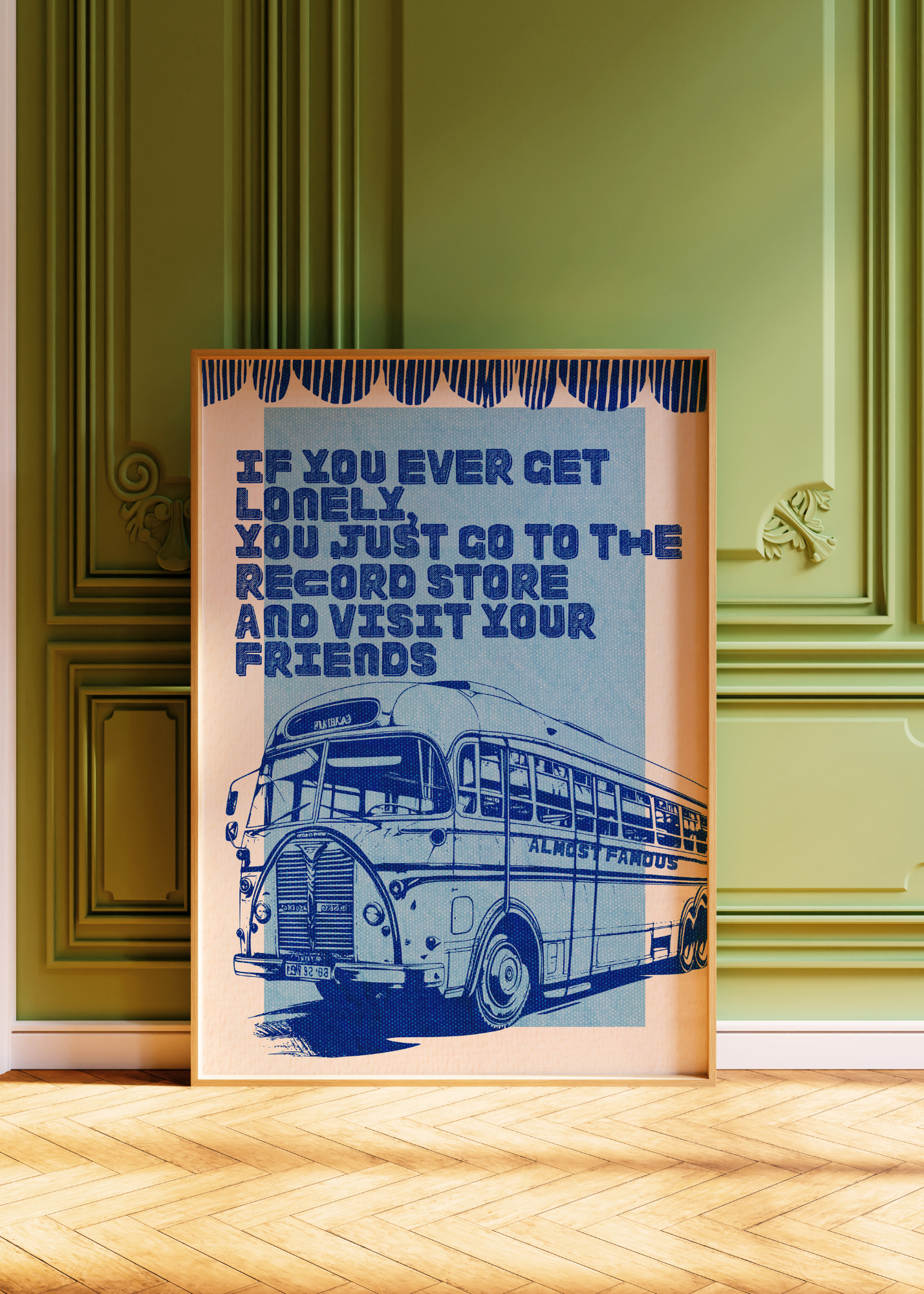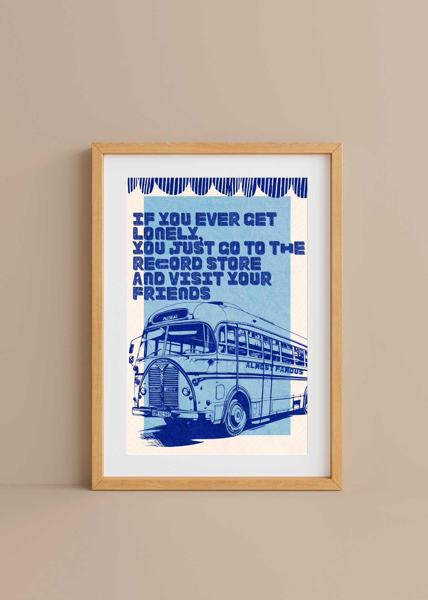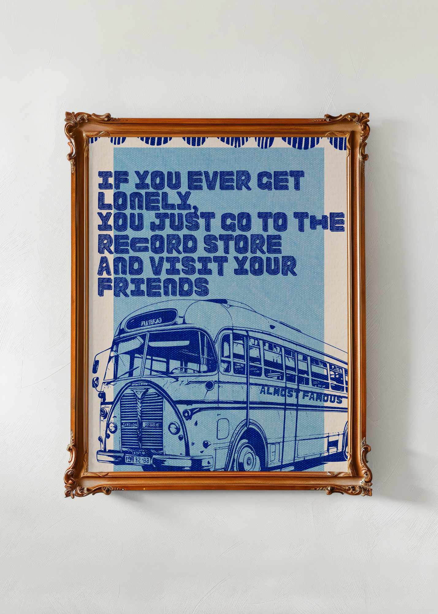 Almost Famous— A soft ode to the dreamers, the wanderers, and the ones who find home in a song. Set against a gentle blue backdrop, a simple line-drawn tour bus rolls across the scene. Above it, the words: “If you ever get lonely, you just go to the record store and visit your friends.” A tribute to music, friendship, and the kind of connection that never fades, this piece carries the warmth of vinyl and the golden glow of 1970s soul.