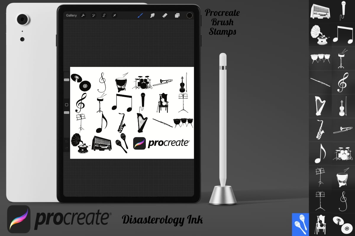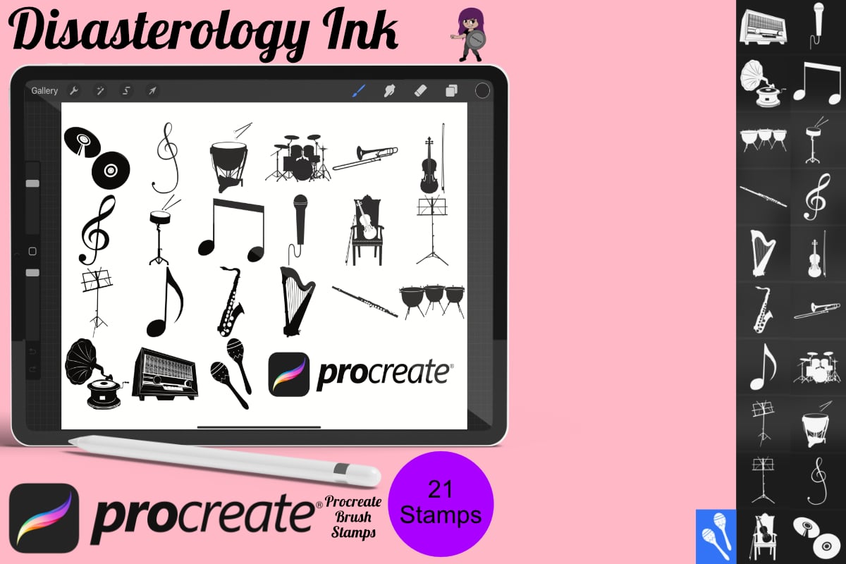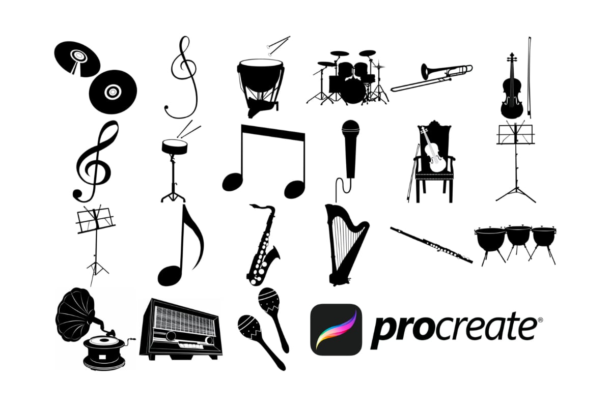 Pack of 21 music icons Procreate Stamp Brushes! These musical instruments and icon stamps are perfect for making illustration projects or any procreate purpose. You can use these in any colour or opacity and they can be resized to best fit your art. You need Procreate 5.0.8 or 5X, an iPad, and an Apple Pencil. Also, these stamp brushes are not pressure sensitive and can be used with third party stylus, Apple Pencil or even your finger. You can change the colour, size and opacity of these stamps.