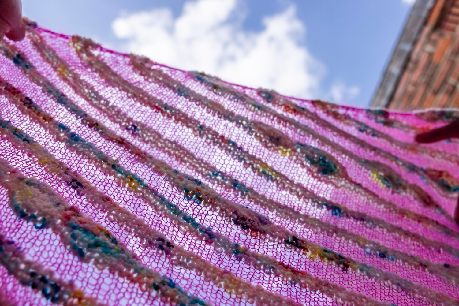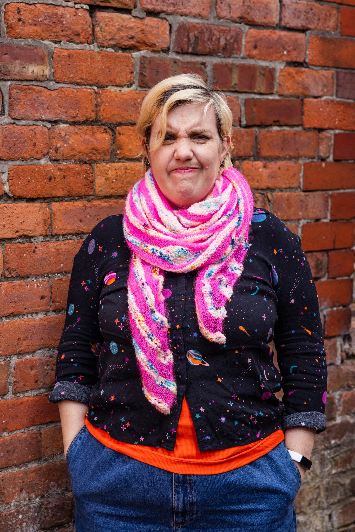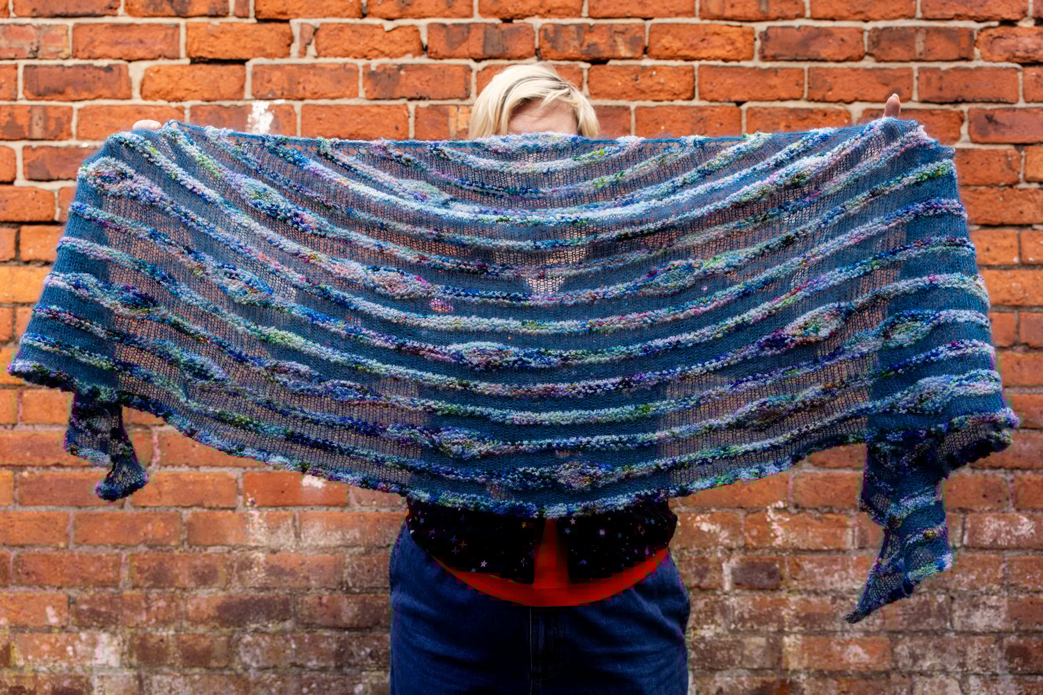 This shawl is designed to show off a skein of fancy- pants yarn, by pairing it with a finer yarn, to make a sheer background. It’s a chilled-out pattern that you can memorise and customise, depending on how the mood takes you. The play of texture looks like vapour trails and cumulus on a clear sky. Or possibly like the wrinkles on Nora Batty’s tights.
