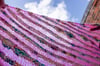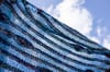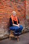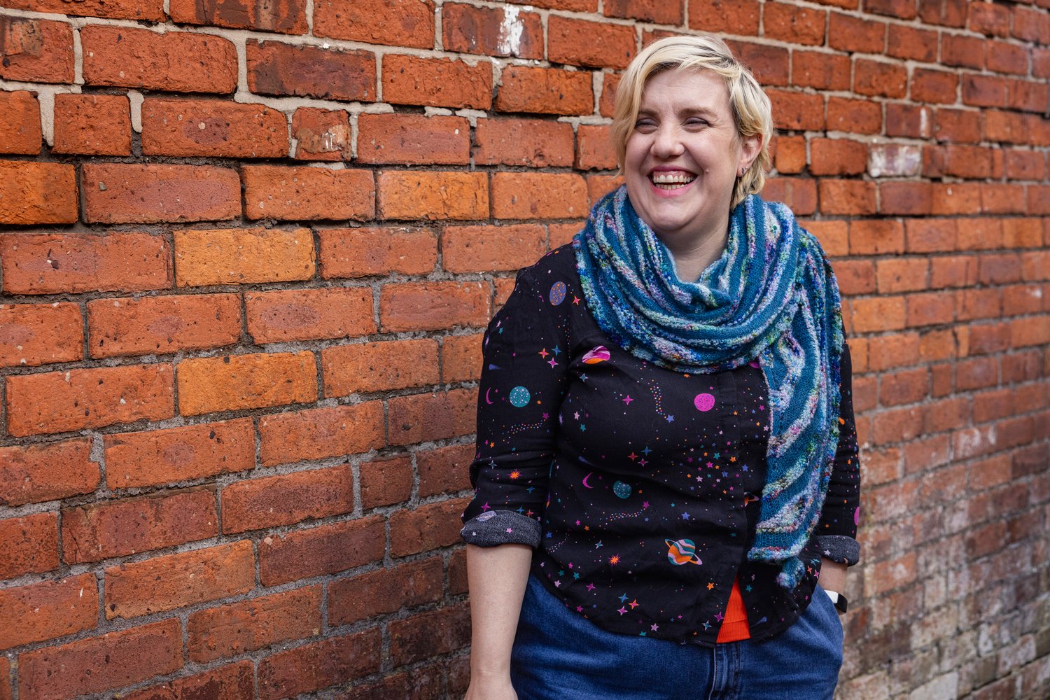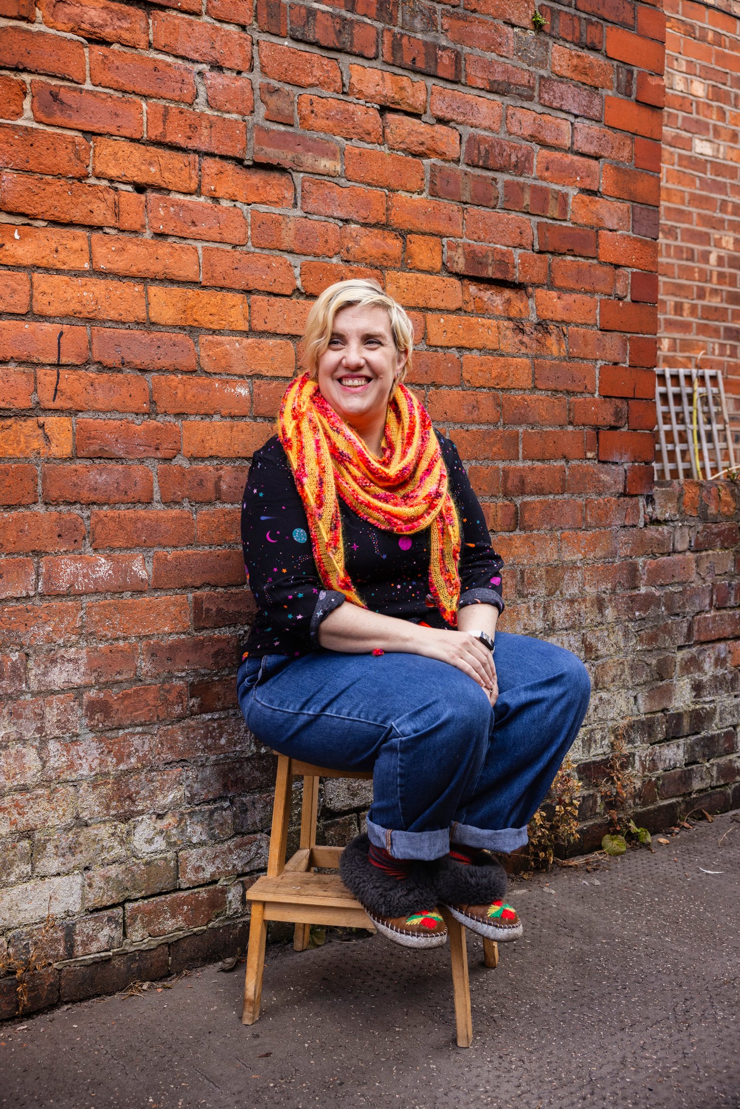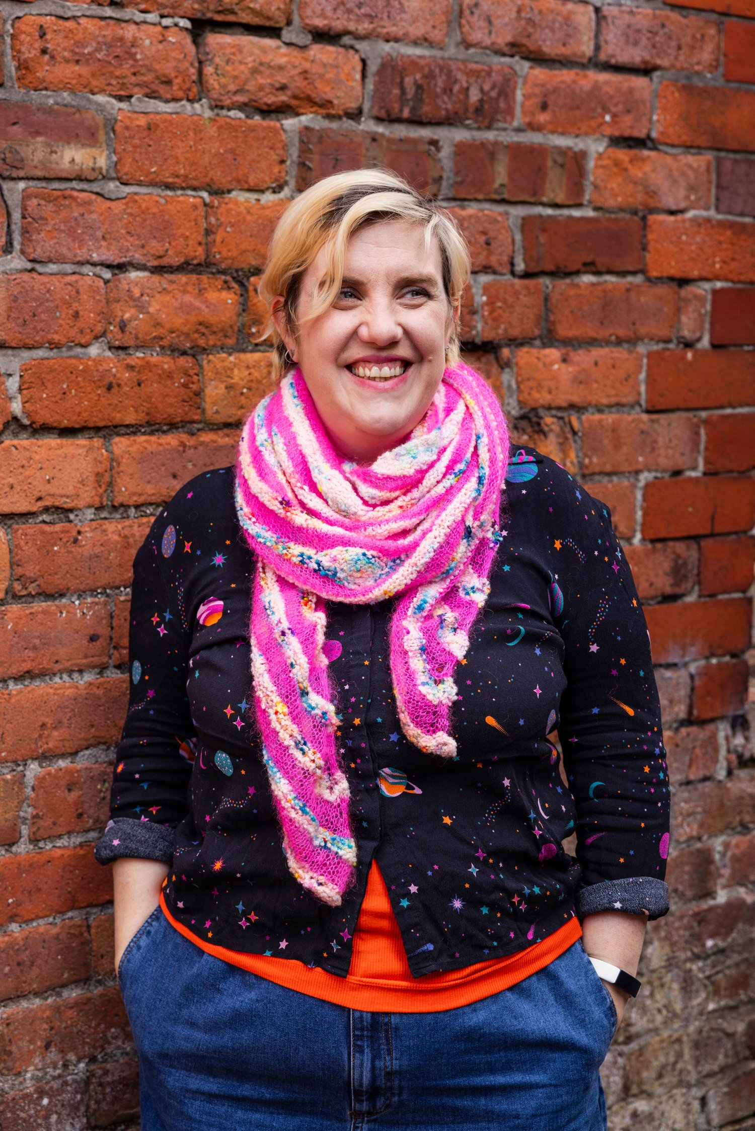 This shawl is designed to show off a skein of fancy- pants yarn, by pairing it with a finer yarn, to make a sheer background. It’s a chilled-out pattern that you can memorise and customise, depending on how the mood takes you. The play of texture looks like vapour trails and cumulus on a clear sky. Or possibly like the wrinkles on Nora Batty’s tights.