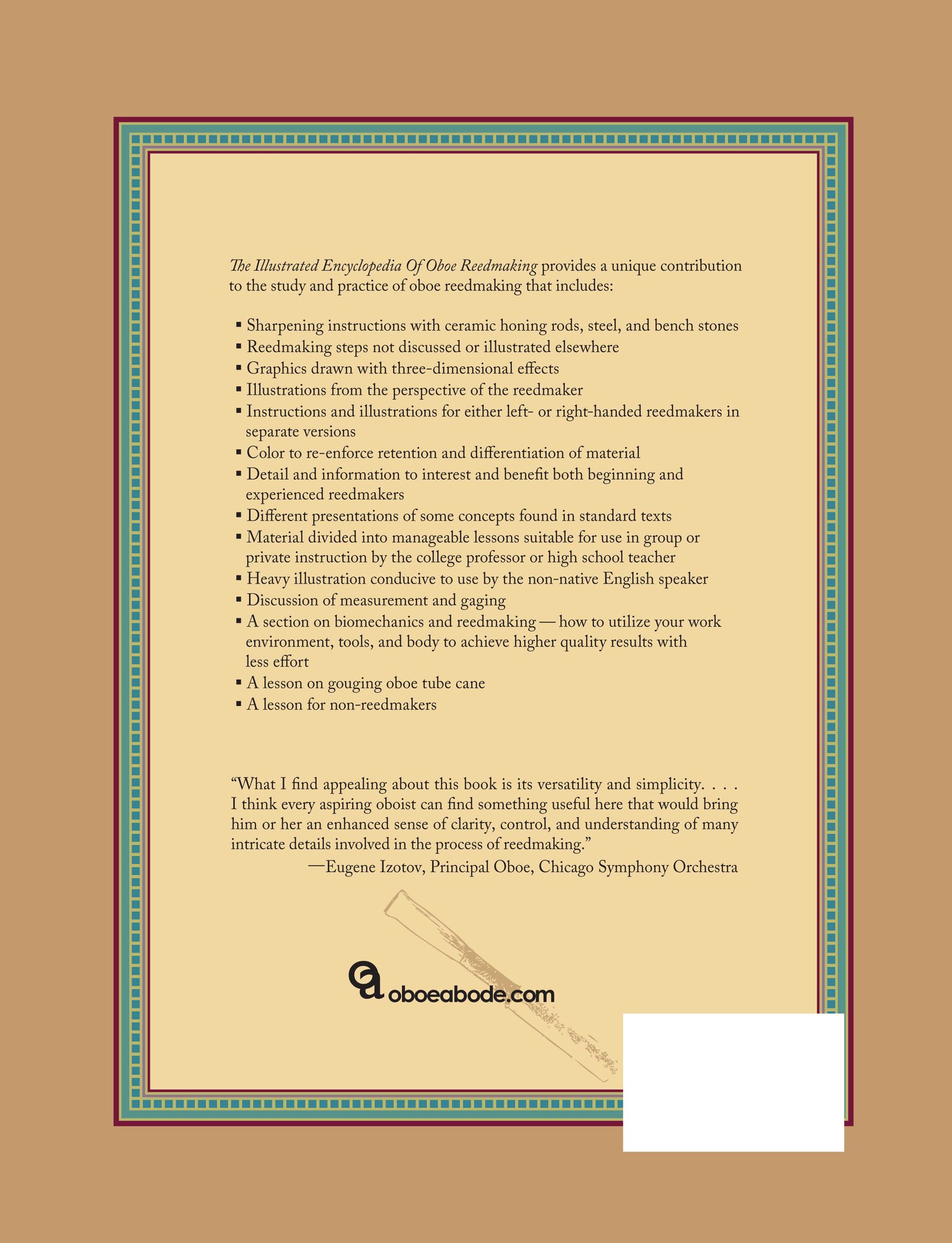 A comprehensive reference and textbook on oboe reedmaking that covers: scraping, sharpening, and cane and reed blank preparation. Includes a lesson for non-reedmakers.