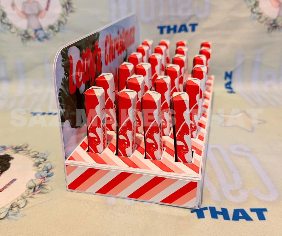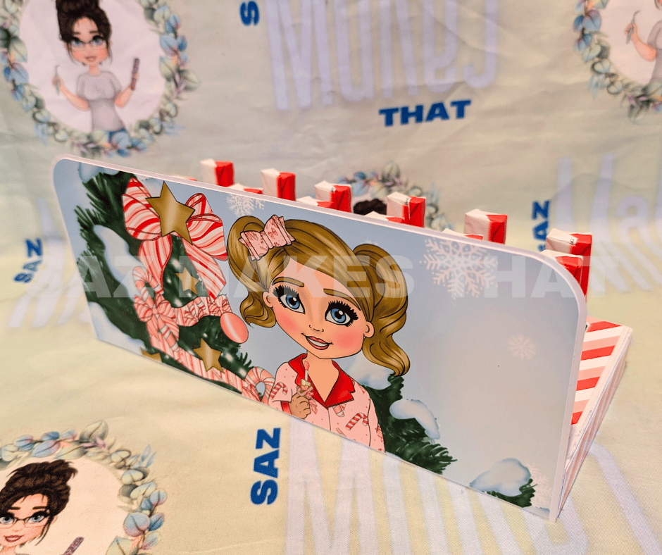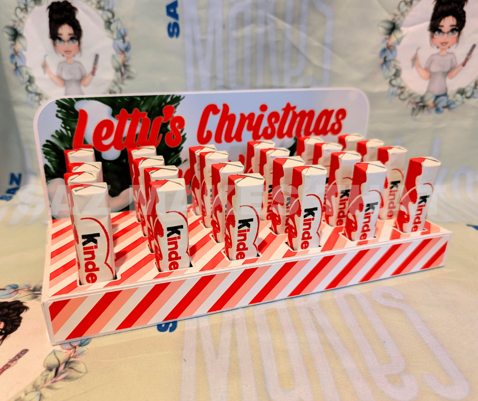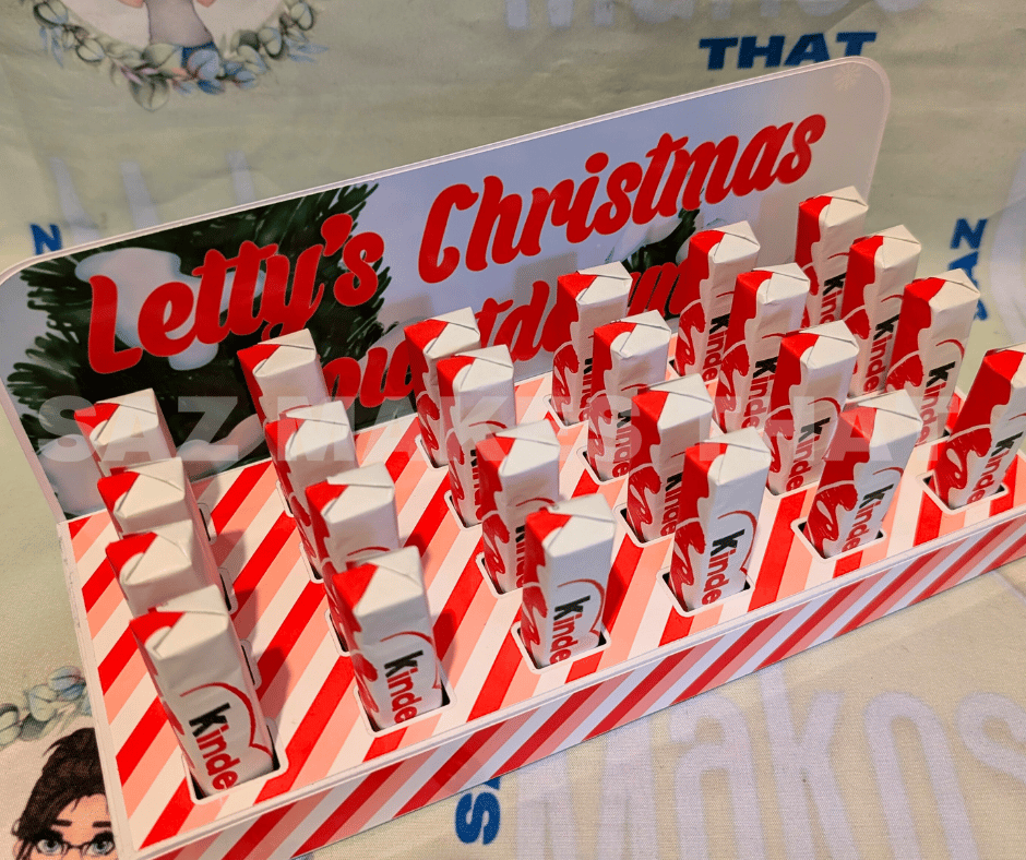 the file fits 24 of the small 12.5g kinder bars that you can buy in packs of 8 from most supermarkets, it also includes a template to make sticker wraps for each bar to add numbers to if you wish. This box can be personalise with images and text for print then cut or just cut from plain or patterned card. This is an A4 friendly project.