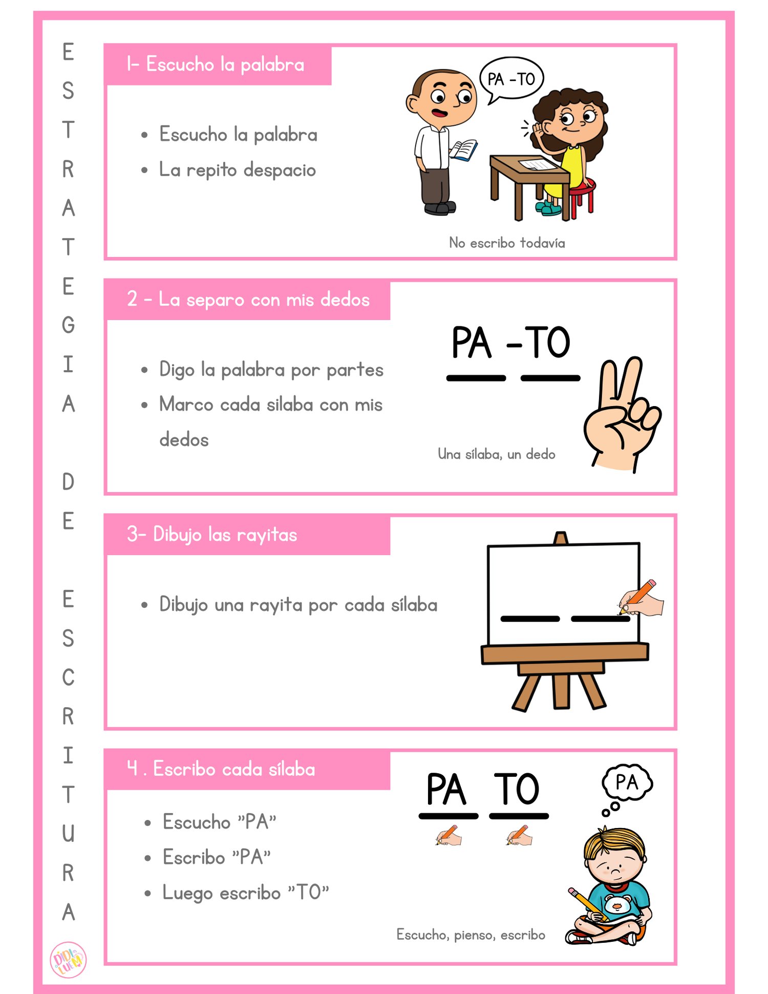 Este apoyo visual guía paso a paso el proceso de escritura de palabras a través de una secuencia estructurada que integra conciencia silábica y correspondencia fonema-grafema.