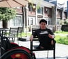 She uses a wheelchair to travel most of the time, and she uses a pair of small stools where the wheelchair is inconvenient to move. Or, walking on her hands.