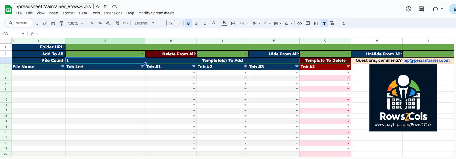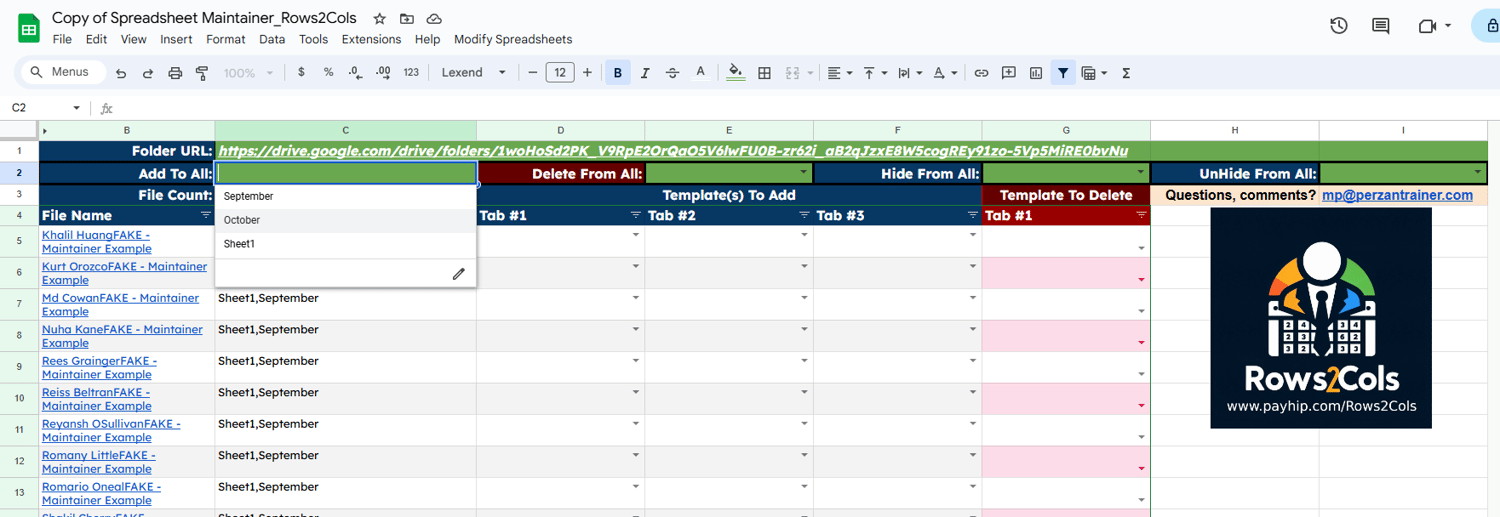 This setup allows you to import spreadsheets from a folder and then add/delete/hide/unhide sheets in all the spreadsheets or just some of them. This makes it easy to maintain multiple spreadsheets for users.