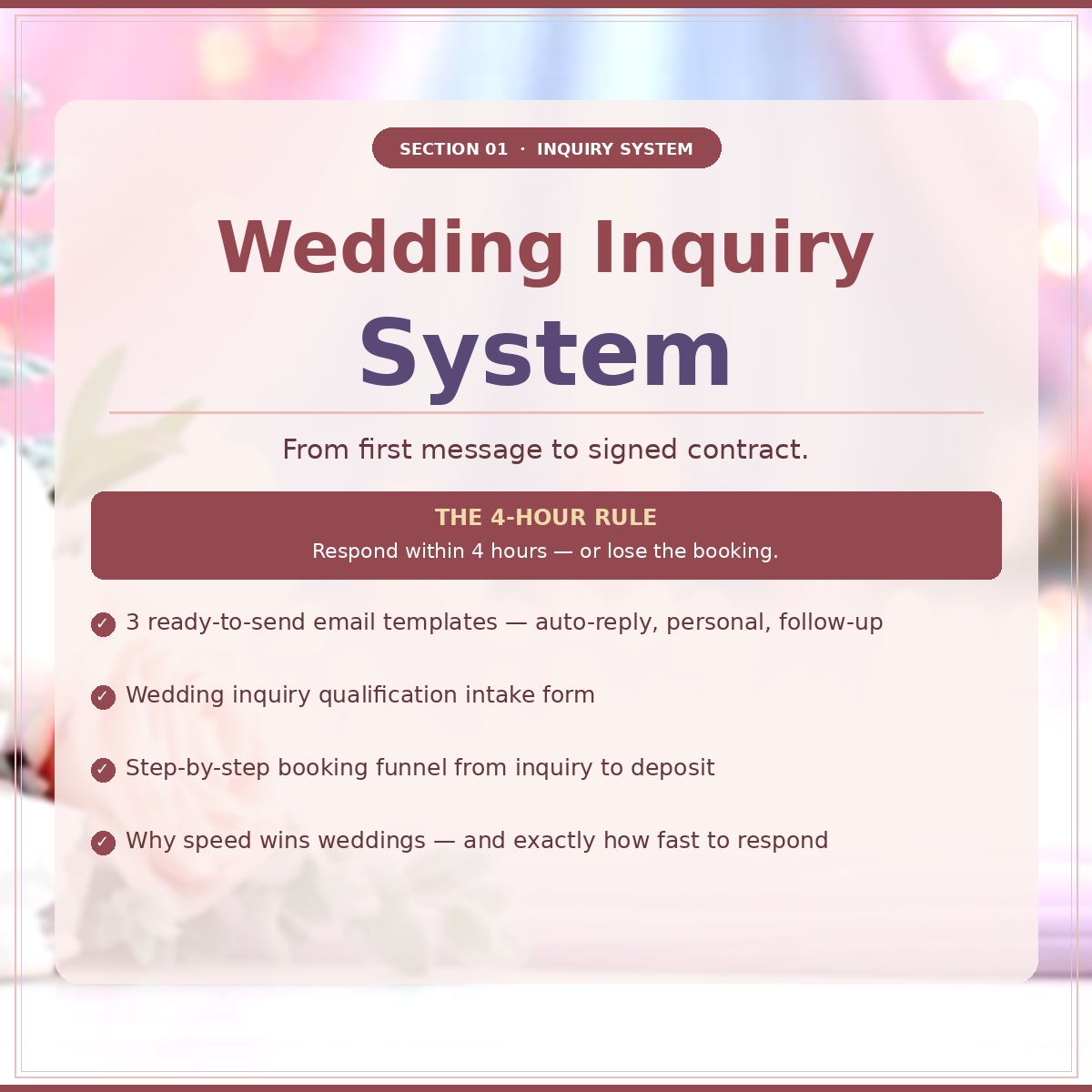 ✅ Section 1: Wedding Inquiry System — 3 ready-to-send email templates + qualification intake form. Never lose a booking to slow response times again.