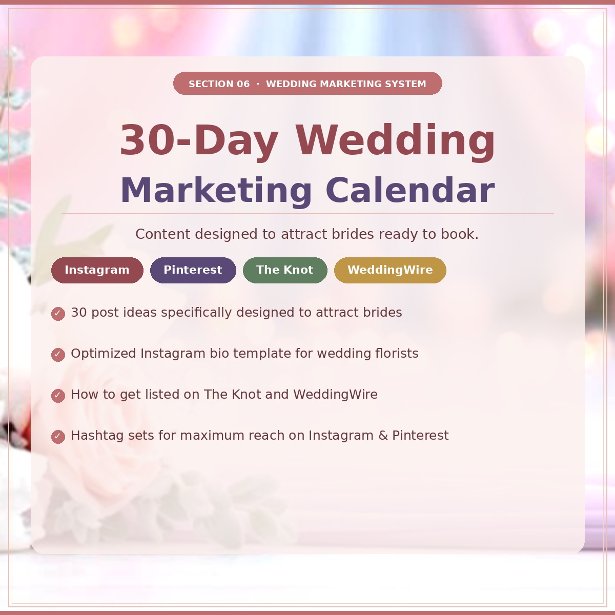 ✅ Section 6: 30-Day Wedding Marketing Calendar — 30 post ideas designed specifically to attract brides who are ready to book right now.