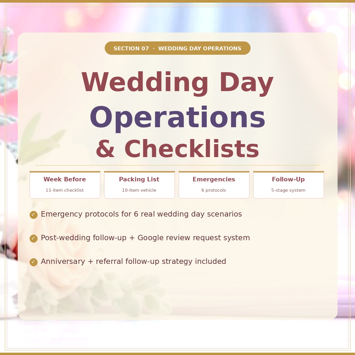 ✅ Section 7: Wedding Day Operations — Full week-before checklist, vehicle packing list, emergency protocols for 6 scenarios, and a post-wedding follow-up system.