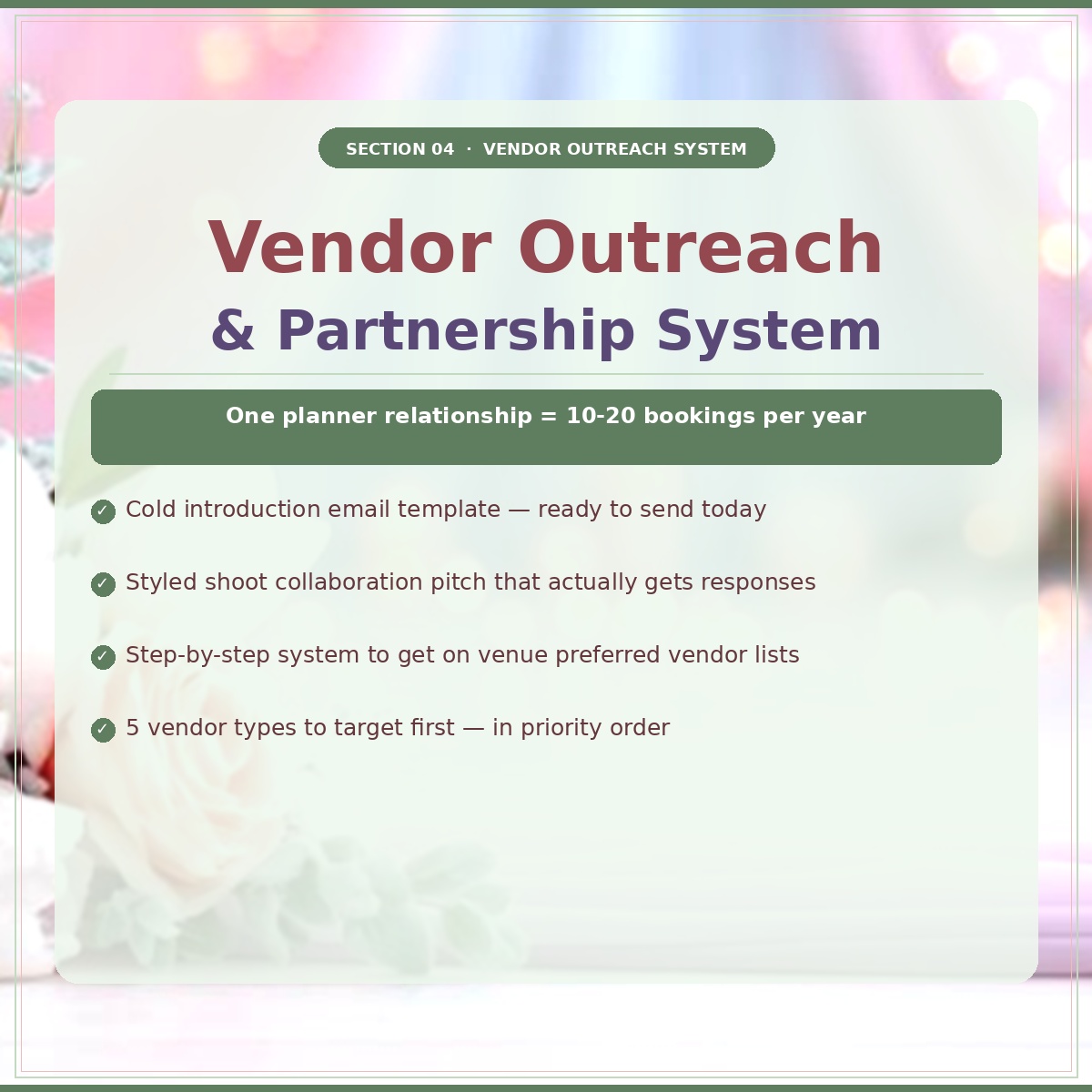 ✅ Section 4: Vendor Outreach System — Email templates to reach wedding planners and get listed on venue preferred vendor lists.