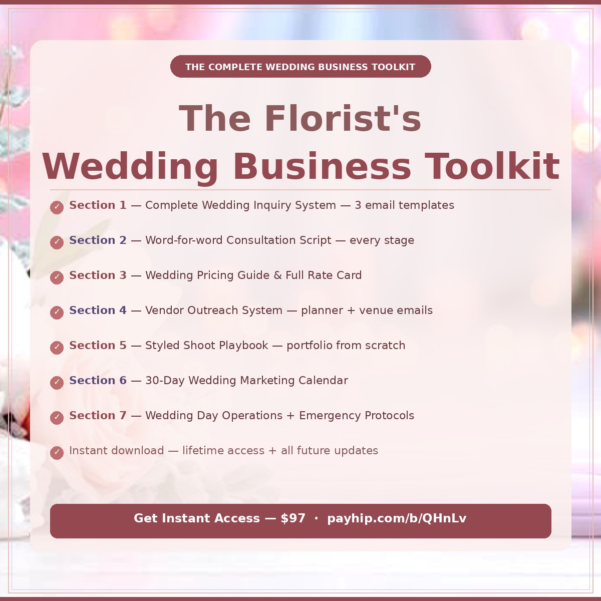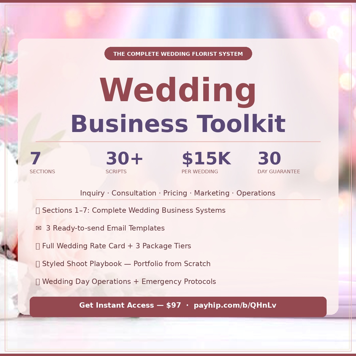 Weddings are the highest-revenue events in floristry — $1,500 to $15,000 in a single day. But without the right systems, scripts, and strategy, they are also the most stressful. This toolkit changes that completely.