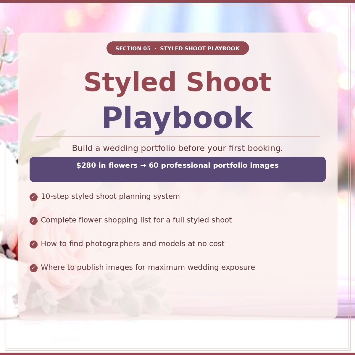 ✅ Section 5: Styled Shoot Playbook — Build a stunning wedding portfolio from scratch in 10 steps. Even if you have never done a wedding.