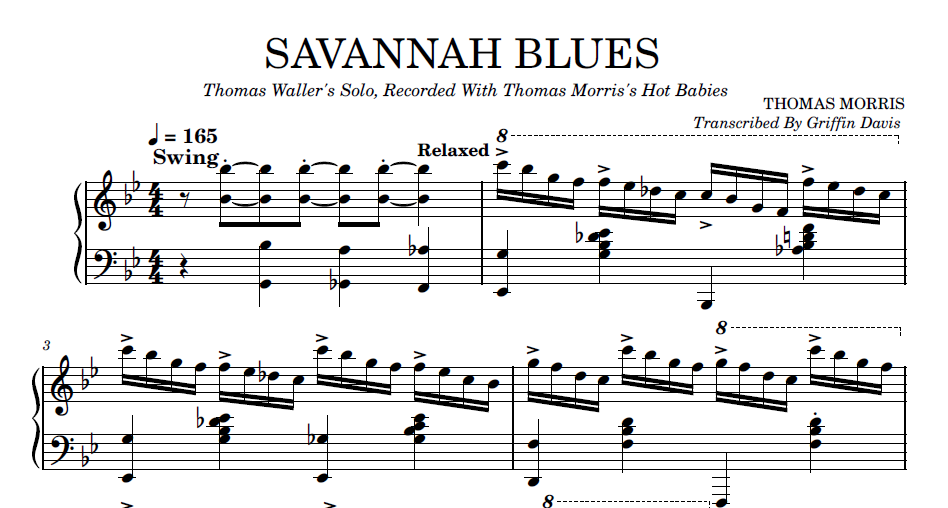 Transcription of Fats Waller's solo on "Savannah Blues," recorded by Thomas Morris's Hot Babies. Recorded on May 20, 1927.