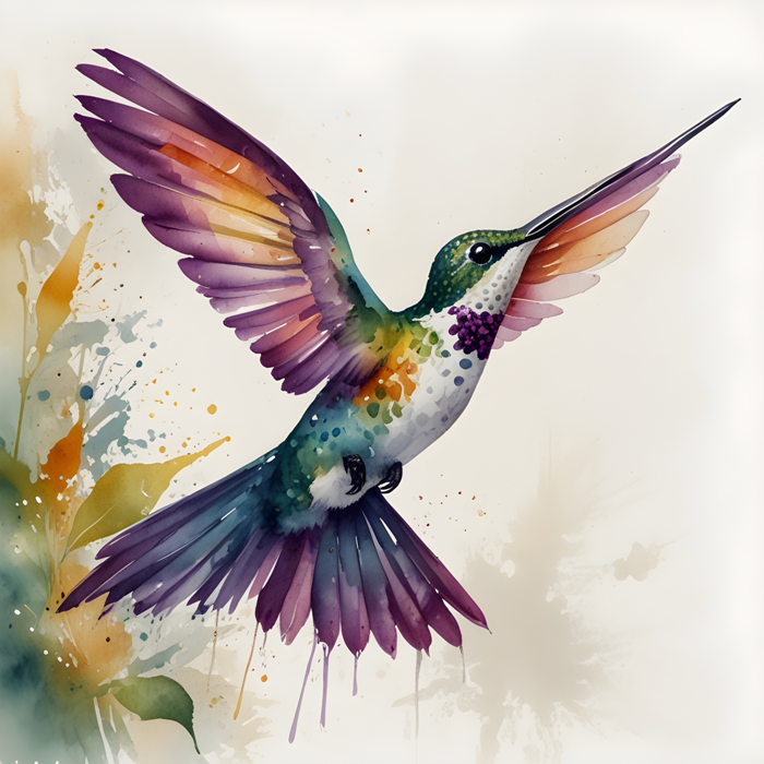 The image is a detailed painting of a colorful hummingbird with vibrant feathers and outstretched wings. The bird appears to be in mid-flight, capturing the beauty and grace of this tiny creature. The artwork showcases intricate details of the bird's features and the delicate texture of its feathers.