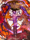 Golden dots shimmer around her, like the unseen hands that guide you. The deep brown frame and speckled corner hold her in grounded wisdom, so she may rest with you for years to come.