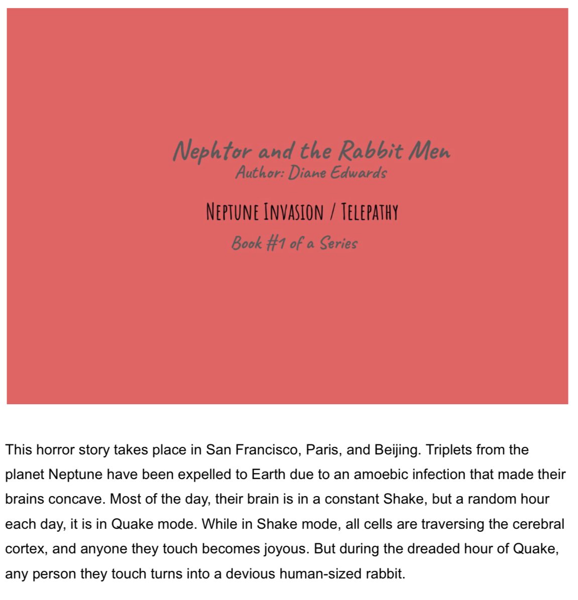 Free Audio Preview! (Book and 1st Chapter Audio). This horror story takes place in San Francisco, Paris, and Beijing. Triplets from the planet Neptune have been expelled to Earth due to an amoebic infection that made their brains concave. Most of the day, their brain is in a constant Shake, but a random hour each day, it is in Quake mode. While in Shake mode, all cells are traversing the cerebral cortex, and anyone they touch becomes joyous. But during the dreaded hour of Quake, any person they touch turns into a devious human-sized rabbit.