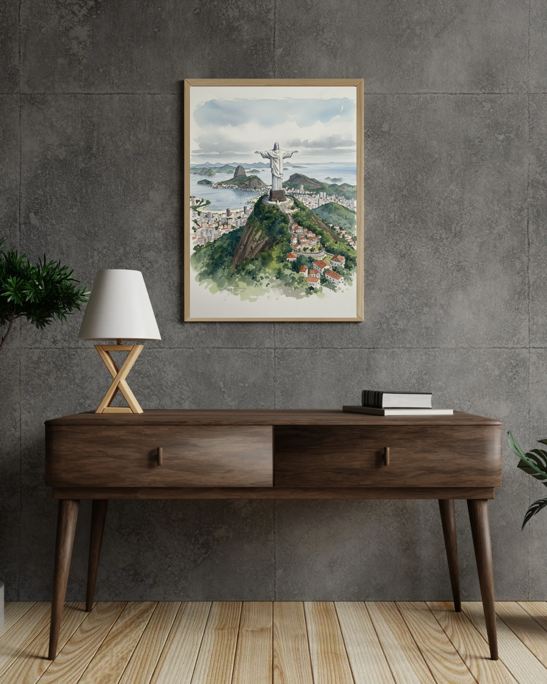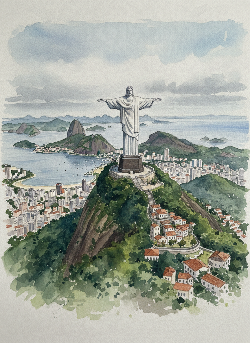 Bathed in a warm, golden haze beneath a cloudy sky, the iconic Christ the Redeemer statue stands tall atop Corcovado Mountain in Rio de Janeiro, Brazil, its outstretched arms embracing the breathtaking landscape below. The photo captures a sweeping view of rugged mountains and distant volcanoes, their silhouettes softened by the mist. The shimmering sea curves gently along the coastline, dotted with clusters of houses nestled into the hillsides. A winding staircase leads up to the statue, drawing the eye toward the monumental figure that watches over the city, blending serenity with grandeur in this captivating scene.