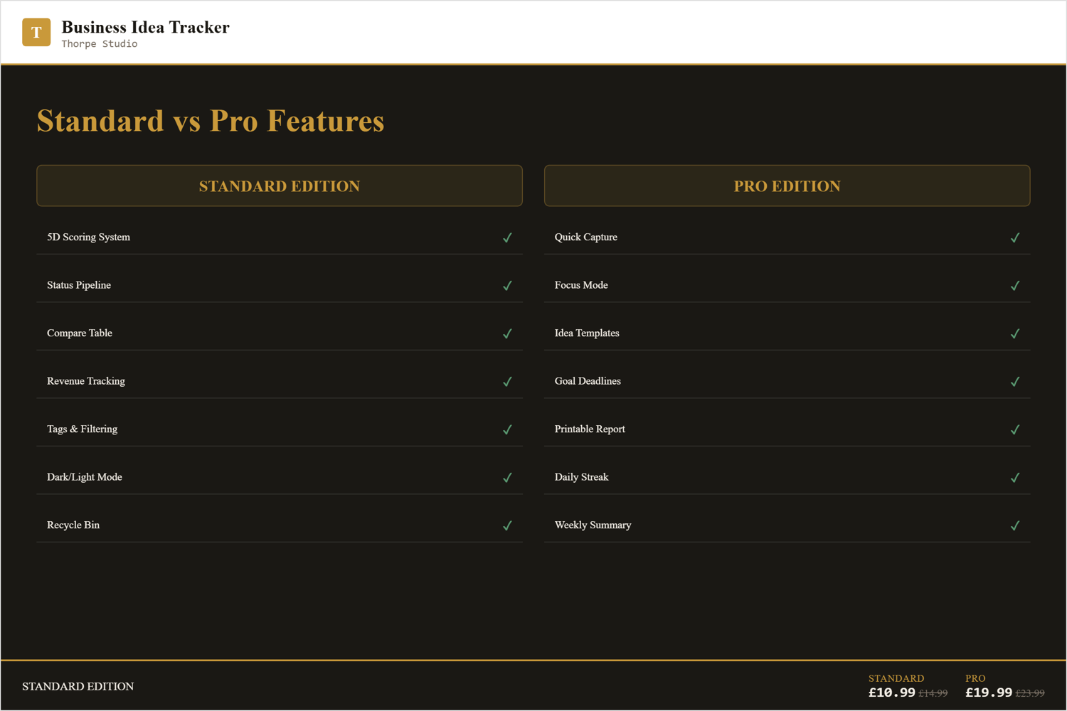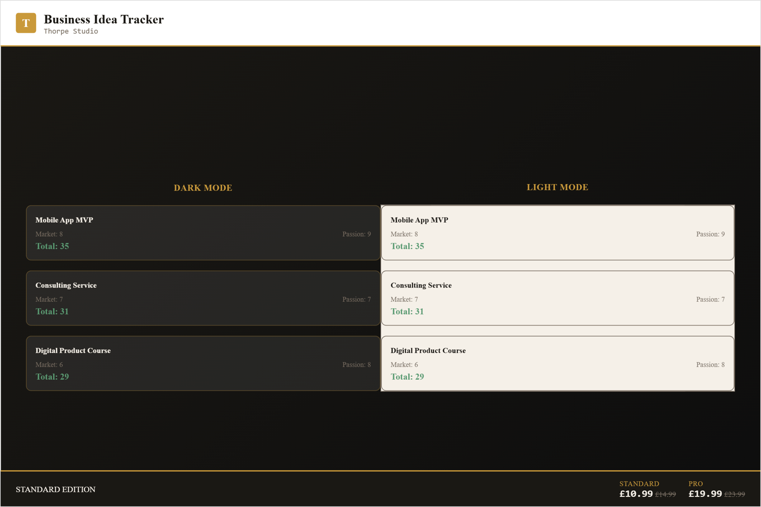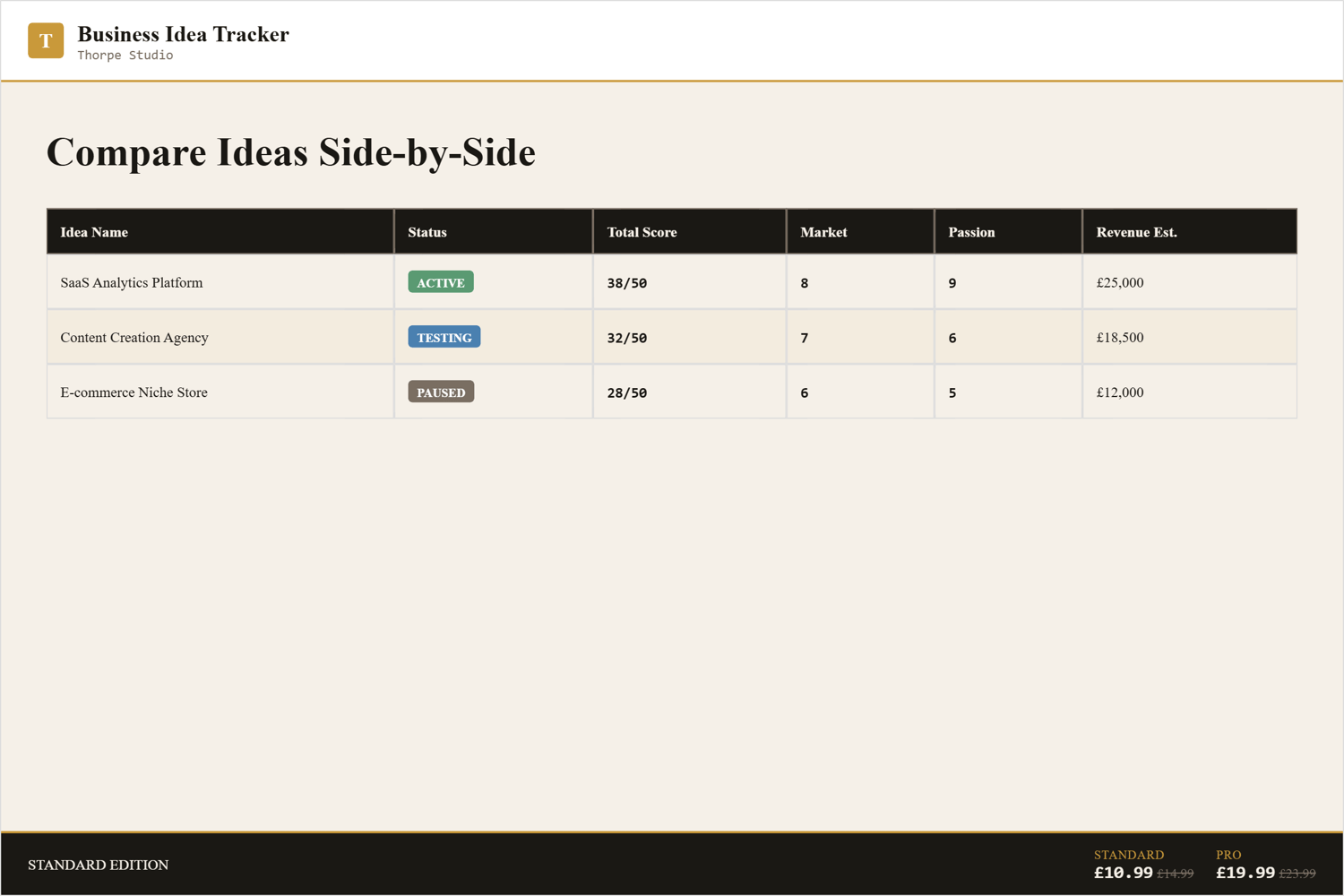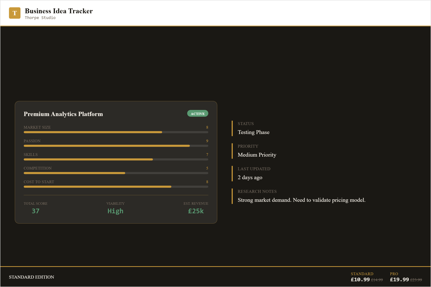 The Business Idea Tracker gives you a structured way to evaluate every idea that lands in your head. No overthinking. No endless spreadsheets. You score each idea across five dimensions—Market Size, Passion, Skills Match, Competition, Startup Cost—and the tool calculates a weighted score instantly. Colour-coded idea cards show you at a glance which concepts are worth pursuing and which ones are distractions. Move ideas through your pipeline: Idea → Testing → Active → Paused → Abandoned. Watch trends over time. Track your monthly revenue goals and celebrate when you hit them (yes, there's confetti).