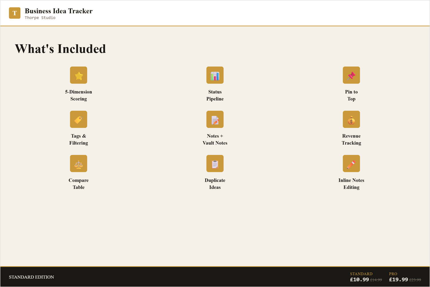 → Solopreneurs and freelancers with a constant stream of ideas → Side-hustlers deciding what to pursue next → Product developers who need a structured evaluation system → Entrepreneurs managing a portfolio of projects or businesses → Anyone tired of Notion dashboards and spreadsheet sprawl