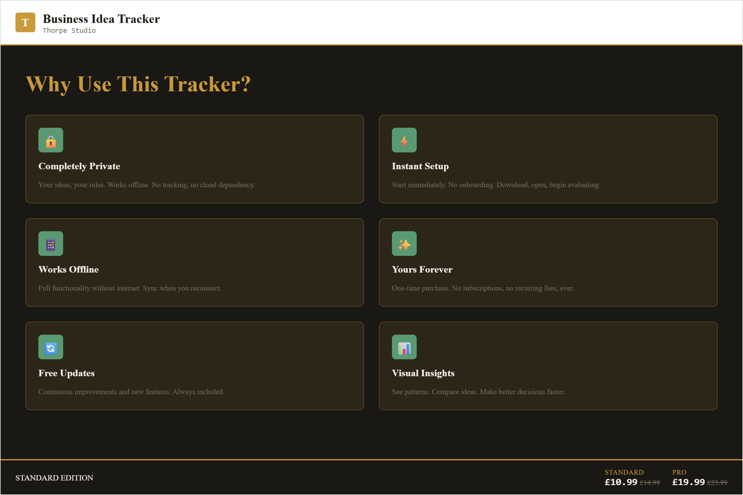 Everything lives in your browser. No Google account. No Notion subscription. No app. Download once, double-click to open, your data saves automatically to your device. Check your ideas in a month. Check them in a year. They'll still be there—because your data never leaves your device.