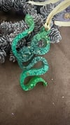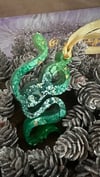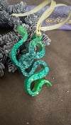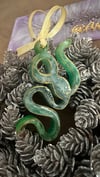 An elegant ornament in the shape of a snake, symbolizing the upcoming year 2025, handcrafted from Italian epoxy resin. The deep emerald color is enhanced with golden accents and a crystalline edge, giving the piece a refined and sophisticated look. Perfect as a decoration for your Christmas tree or as a stylish gift for your loved ones.