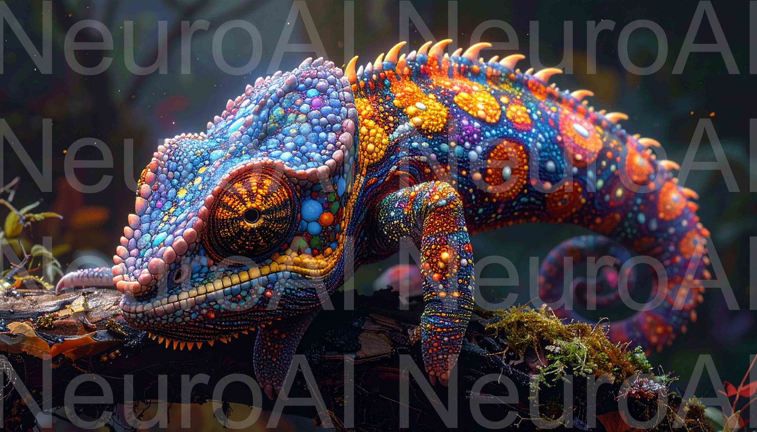 Stunning colorful chameleon resting on mossy branch