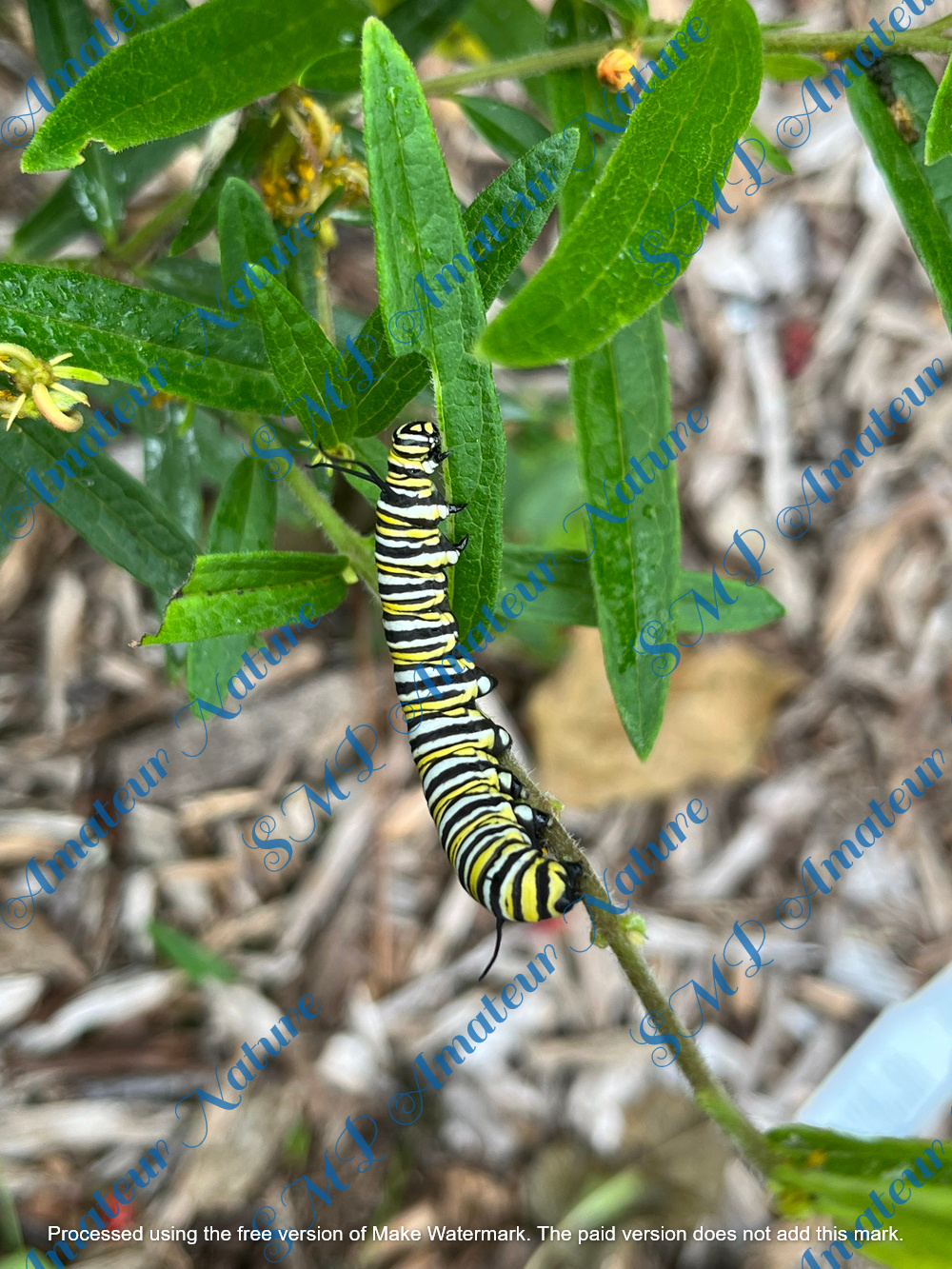 Amateur photograph of a Monarch Butterfly (Danaus plexippus) caterpillar eating some butterfly weed. Butterfly weed is a member of the milkweed family, so it can give the same toxic properties to the caterpillars. Image taken in Virginia, USA. Image pixels 3024x4032. Image easily resized as required for buyer needs. Purchase gives image without any watermark.