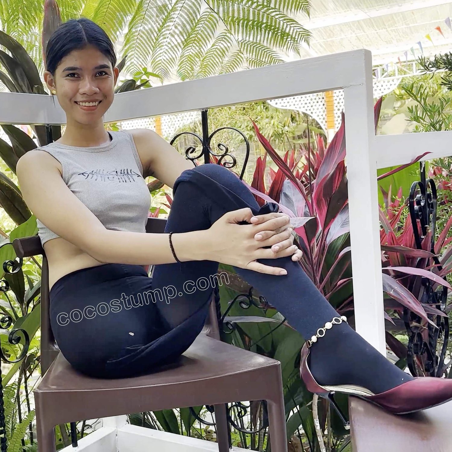 Watch cute Claire, wearing blue leggings and a red high heel. She is crutching around in the garden and show off her beauty. 20 min, 2160p.