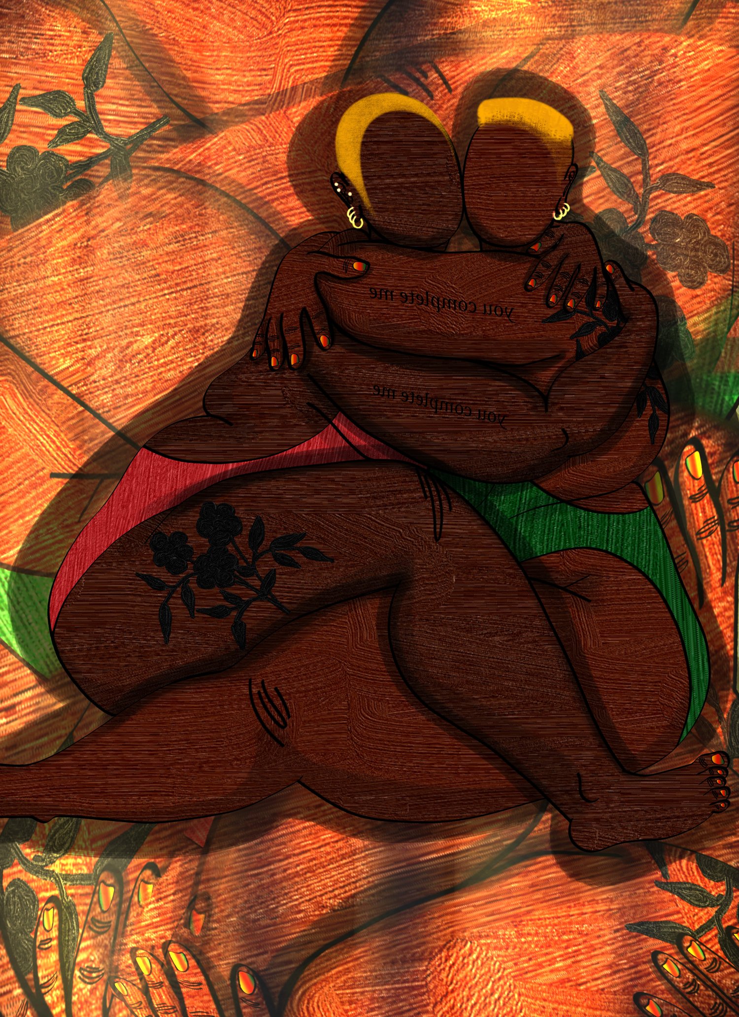 In ‘ycnednepedoc’ I wanted to create a piece that conveys how intimacy can be marred by co-dependency, which is excessive emotional or psychological reliance on a partner. The aspect of co-dependency I wanted to focus on in the work is that of unclear boundaries of self and the feeling of being incomplete without the presence of a partner in your life. In the foreground of the piece is a couple tightly embracing, and the background consists of disjointed close-ups of their limbs. The couple have matching tattoos, which read “you complete me” written in reverse. Although there is no distance between the couple, as they are as close to each other as they can be, and they are holding each other tightly, there is still a disconnect between them. A disconnect I wanted to convey through the tilts of their heads. They aren’t directly facing each other, and their faces are tilted away from one another. At the root of this disconnect is the fact that there is an apprehension about their intimacy; a fear that separation is not only a threat to their individual sense/s of self, but also always imminent.