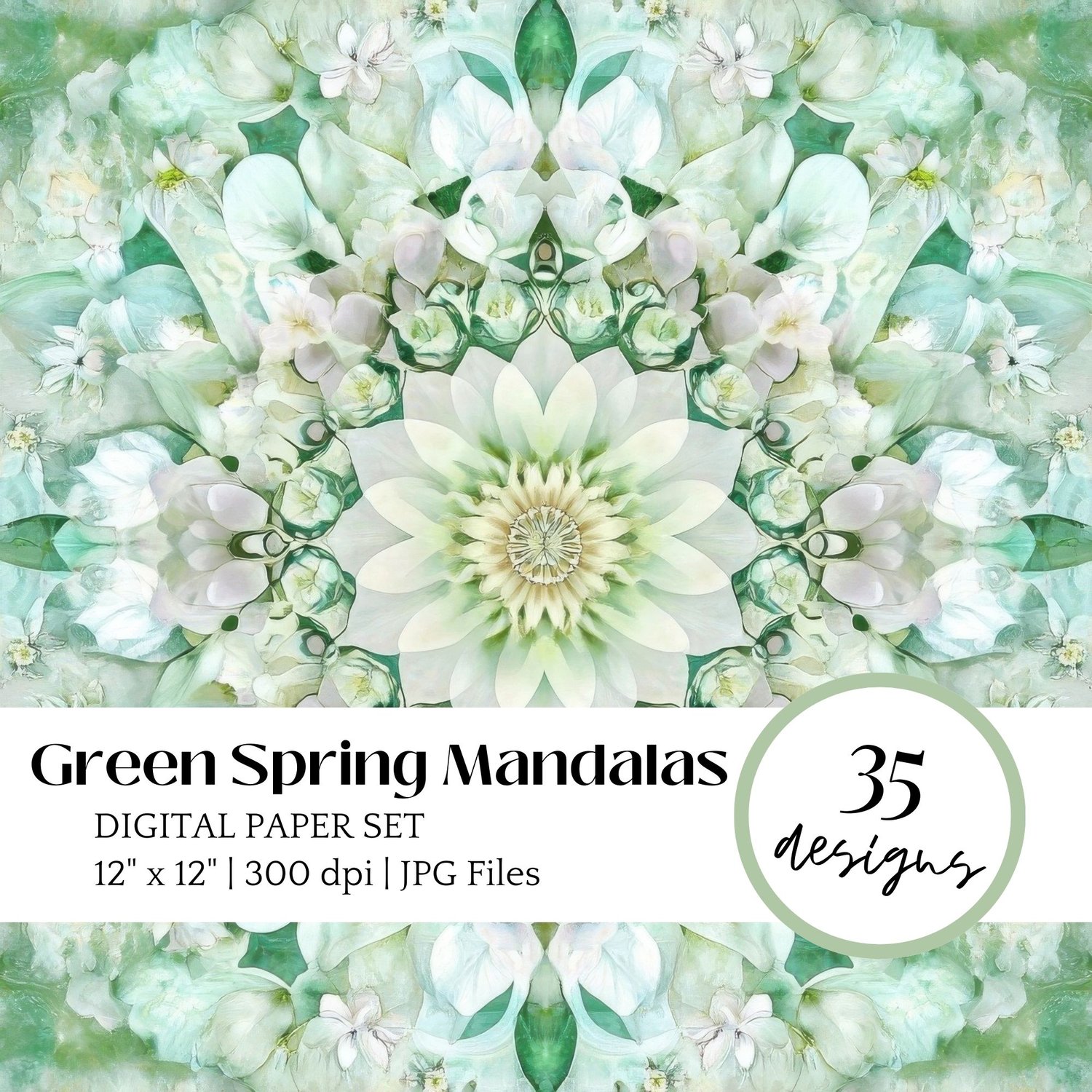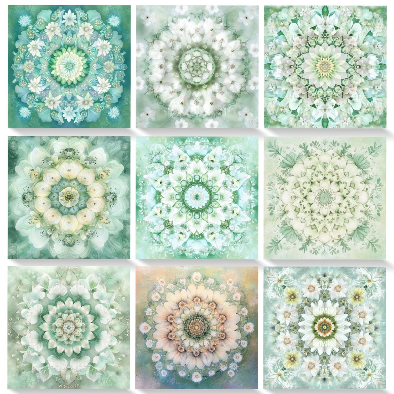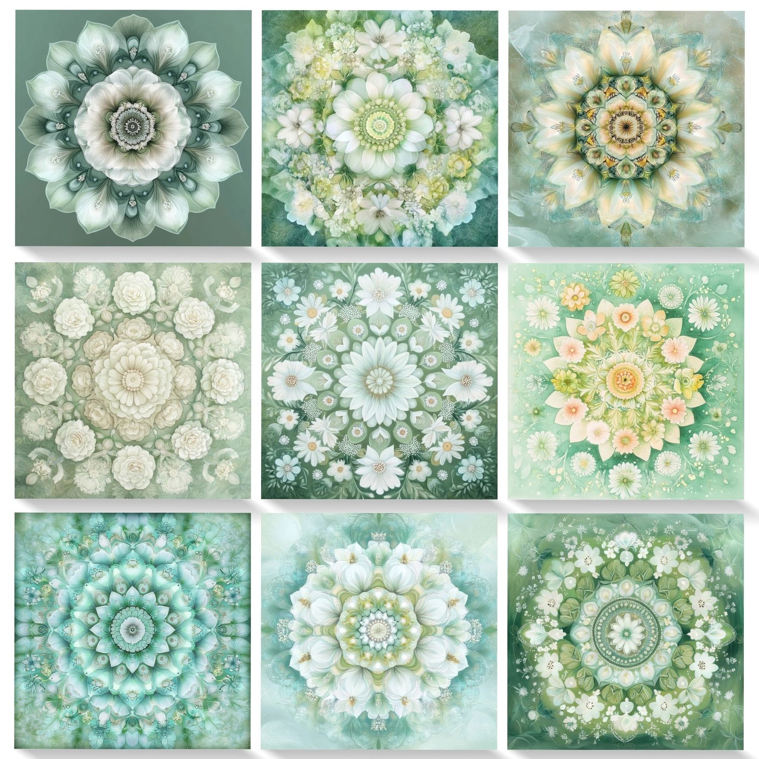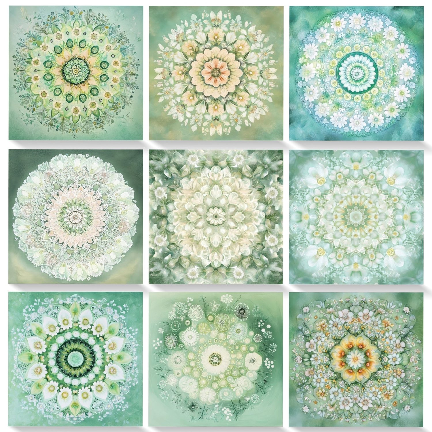 The gentle blend of white spring flowers with varying shades of green creates a peaceful, harmonious atmosphere perfect for spiritual and meditation practices. Each mandala incorporates sacred geometry principles while maintaining a fresh, natural aesthetic.