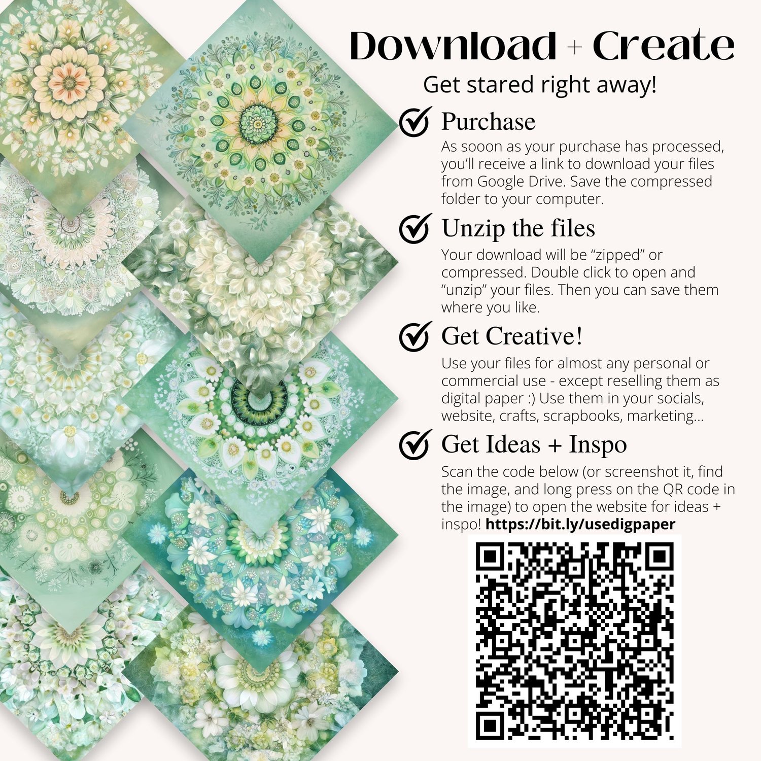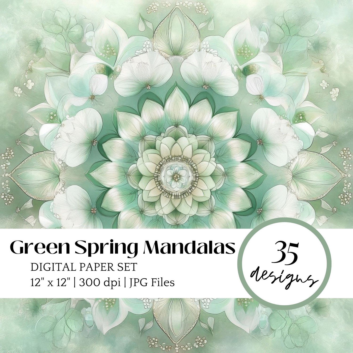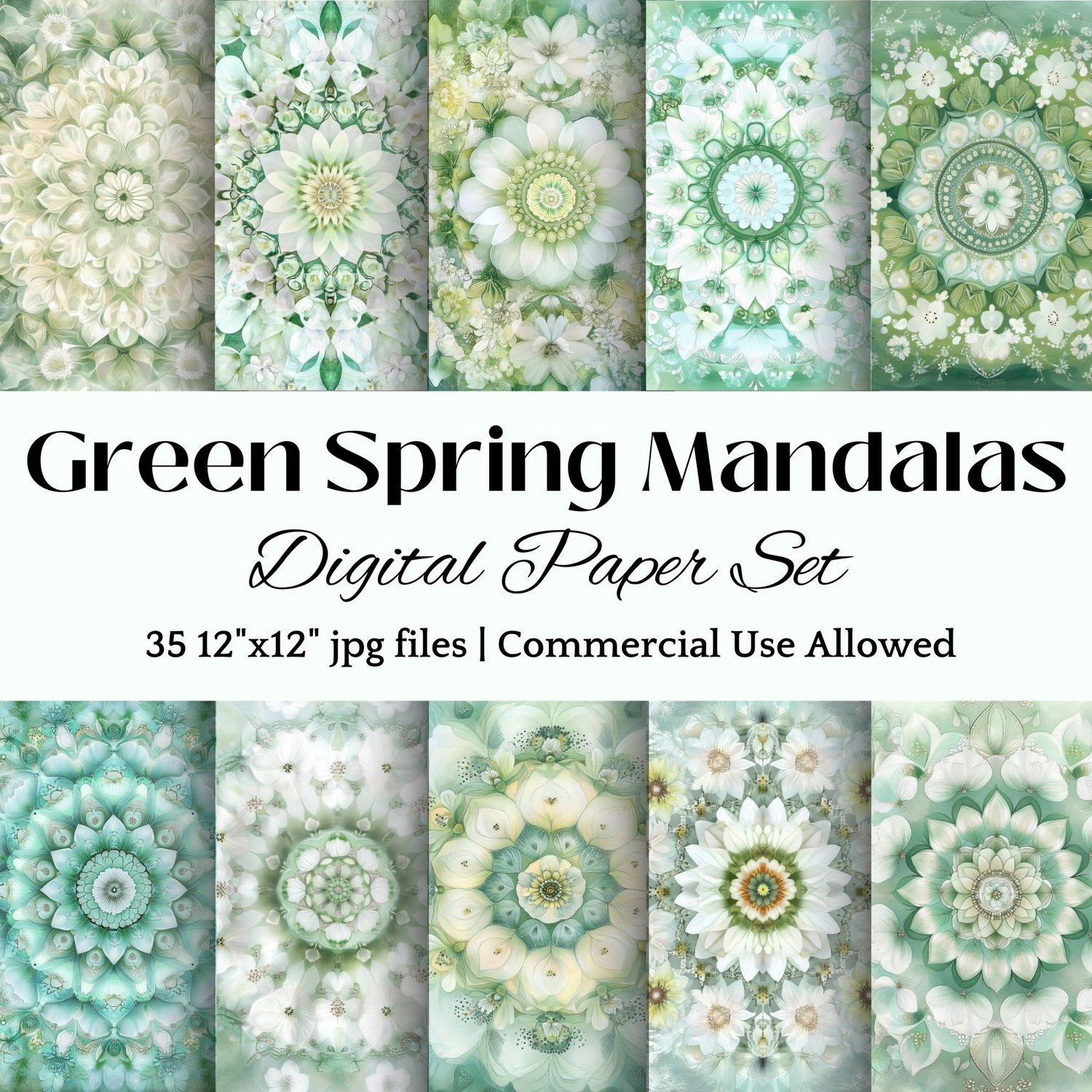 Discover our collection of spring mandala digital papers featuring sacred geometry patterns and heart chakra designs. These high-resolution backgrounds blend white flower mandalas with healing green tones, perfect for meditation spaces and spiritual practices.
